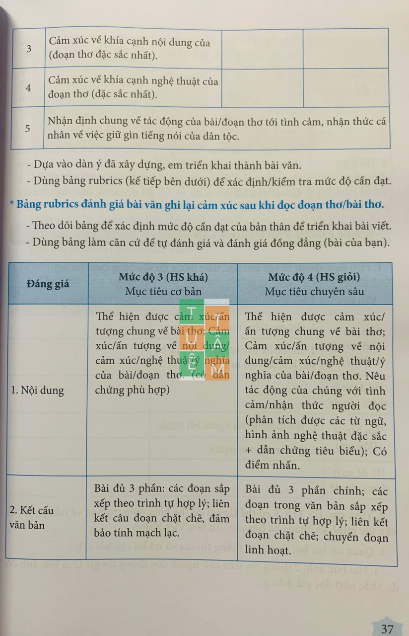 D. Phần viết theo thể loại gồm tìm hiểu yêu cầu mục đích thể loại và khung dàn ý mở, rubric và bảng kiểm để học sinh tự đánh giá bài viết của mình.