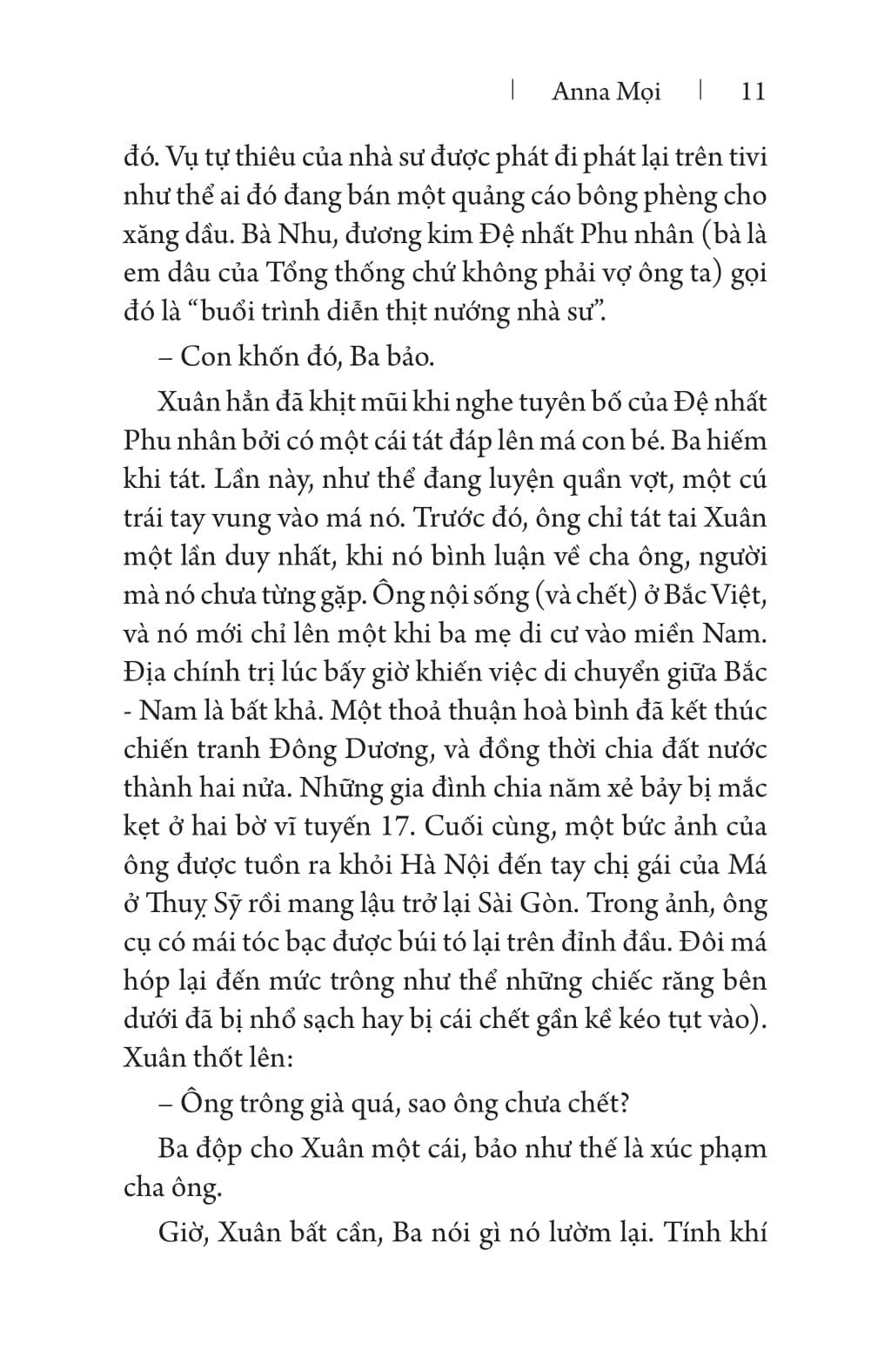 Trong vỏn vẹn một năm cuộc đời, Xuân bước qua tuổi thiếu niên và kết thúc nhanh chóng, trong bối cảnh thời kỳ hậu thuộc địa Pháp và cuộc chiến của người Mỹ, ở một đất nước không tên có thể là Việt Nam. Ba, cha cô, là một sĩ quan quân đội lập dị. Mẹ cô, người đàn bà xoay sở những công việc khó nhằn nhất thời ấy để kiếm sống. Ngoài việc bận tâm đến bộ ngực quá nhỏ của m.ình, Xuân cũng quan tâm đến quan điểm chính trị và yoga của Ba, thuyết “vạn vật hữu linh” của mẹ, số lượng người chết vì chiến tranh hàng ngày và vấn đề khí hậu nóng lên ở đô thị. Cô được Edgar, một thành viên khét tiếng của cơ quan tình báo Pháp khai mở về tình dục, và gia nhập một băng đảng bất kham, đam mê các cuộc đua mô tô trong thành phố và mọi thứ tệ nạn đương thời: m.a túy, rượu, tình dục buông thả. Khác xa với bầu không khí hoài cổ đặc trưng trong những hồi tưởng về tuổi trẻ lạc lối, giọng điệu của câu chuyện vừa châm biếm vừa gợi cảm, nhịp độ nhanh, gấp. Ở Anna Moï, tuổi trẻ là tất cả những gì tốt đẹp, kể cả trong tình cảnh thảm họa lịch sử và bi kịch chiến tranh.