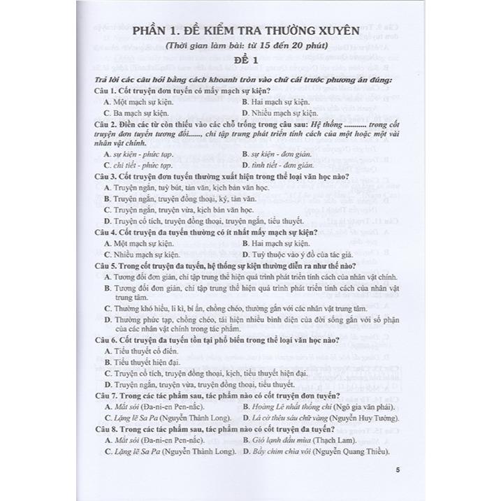 Trong những năm gần đây, đề kiểm tra Ngữ văn bậc phổ thông không còn là dạng đề truyền thống có tính chất mệnh lệnh hay áp đặt mà đã có sự thay đổi theo hướng mở. Nhằm giúp học sinh trau dồi kiến thức, góp phần bồi dưỡng học sinh khá, giỏi có thêm nguồn tài liệu học tập môn Ngữ văn theo chương trình mới, chúng tôi tiếp tục biên soạn cuốn Ôn tập cuốn Ôn tập - Kiểm tra nâng cao và phát triển năng lực Ngữ văn 8, tập một, dùng cho cả ba bộ sách Kết nối tri thức với cuộc sống, Chân trời sáng tạo và bộ sách Cánh Diều. Sách có 2 phần: Phần 1. Các đề kiểm tra thường xuyên Phần này có 32 đề, tùy vào từng dạng đề và năng lực khác nhau, thời gian làm bài từ 15 phút đến 20 phút. Các đề ở phần này là các dạng câu hỏi trắc nghiệm khách quan sẽ giúp các em ôn tập lại các kiến thức cơ bản đã học trong sách giáo khoa Ngữ văn 8, tập một. Phần 2. Các đề kiểm tra định kỳ Phần các đề kiểm tra định kỳ có 40 đề, được chia thành đề kiểm tra 1 tiết (thời gian làm bài 45 phút) và đề kiểm tra 2 tiết (thời gian làm bài 90 phút). Mỗi đề luyện tập có thể là một đoạn văn, đoạn thơ hoặc một văn bản được lấy làm ngữ liệu để xây dựng các dạng câu hỏi. Nội dung các câu hỏi đi từ các mức độ nhận thức của học sinh như: Nhận biết, Thông hiểu, Vận dụng, Vận dụng cao. Phần viết có nhiều kiểu bài, sẽ giúp các em có thêm những khám phá thú vị khi luyện viết các đoạn văn và bài làm văn khác nhau nhằm nâng cao năng lực ngôn ngữ và năng lực Ngữ văn của mình. Đặc biệt, phần cung cấp các đoạn văn, bài văn tham khảo sẽ giúp các em rút ra được những bài học, những kinh nghiệm trong việc nâng cao kỹ năng viết văn của mình. Với 72 đề ôn luyện Ngữ văn, cuốn Ôn tập - Kiểm tra nâng cao và phát triển năng lực Ngữ văn 8, tập một, được biên soạn bám sát các chủ đề có trong Chương trình Ngữ văn mới, có mở rộng và có nâng cao thêm các ngữ liệu ngoài chương trình, phù hợp với yêu cầu đổi mới kiểm tra, đánh giá môn Ngữ văn theo định hướng phát triển năng lực học sinh. Với nội dung và cấu trúc như thế, chúng tôi hy vọng cuốn Ôn tập - Kiểm tra nâng cao và phát triển năng lực Ngữ văn 8, tập một sẽ là một tài liệu tham khảo hữu ích với các thầy cô giáo trong việc dạy học, kiểm tra đánh giá môn Ngữ văn. Với các em học sinh, chúng tôi hy vọng các em sẽ có hứng thú khi tự mình chinh phục với các dạng đề có trong sách giáo khoa, các dạng đề nâng cao. Sau khi làm bài xong, các em sẽ đối chiếu với phần Đáp án với các đề trắc nghiệm khách quan phần Hướng dẫn làm bài với các đề tự luận để có thể tự đánh giá được nội dung kiến thức mà mình đã đạt được, có định hướng ôn tập những nội dung kiến thức mình chưa đáp ứng được so với yêu cầu đặt ra.