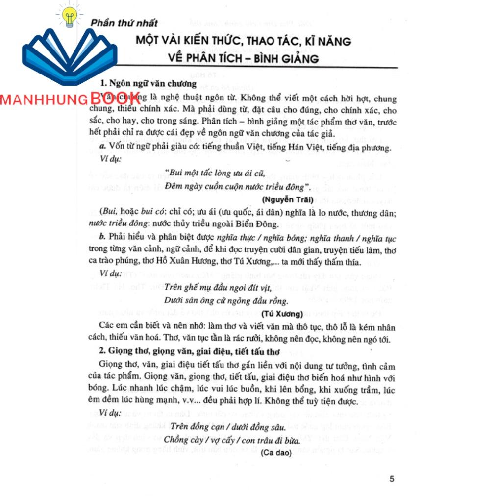 • Phần thứ nhất: Giới thiệu khái quát về kiến thức và những kĩ năng, thao tác về phân tích - bình giảng thơ văn. Đây là những kiến thức cơ bản giúp các em hiểu để học và hành, để làm tốt các bài tập làm văn Cảm thụ văn học (nghị luận văn chương).