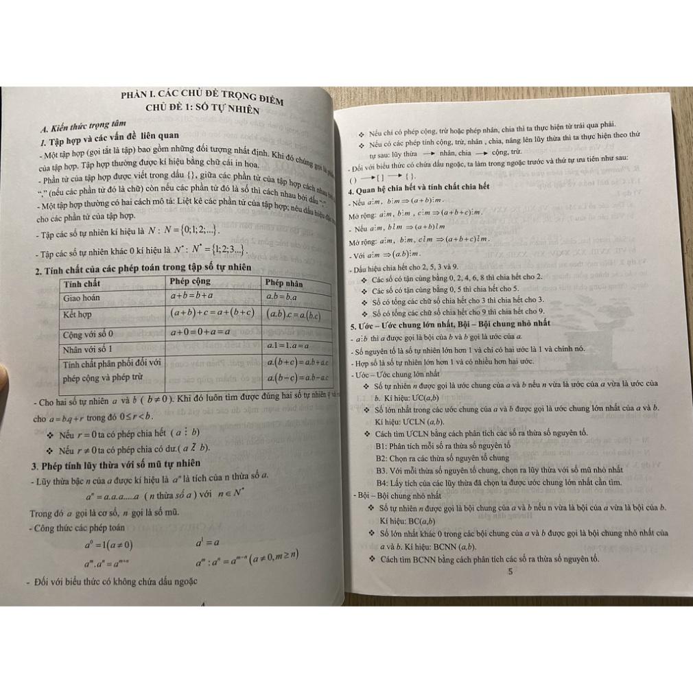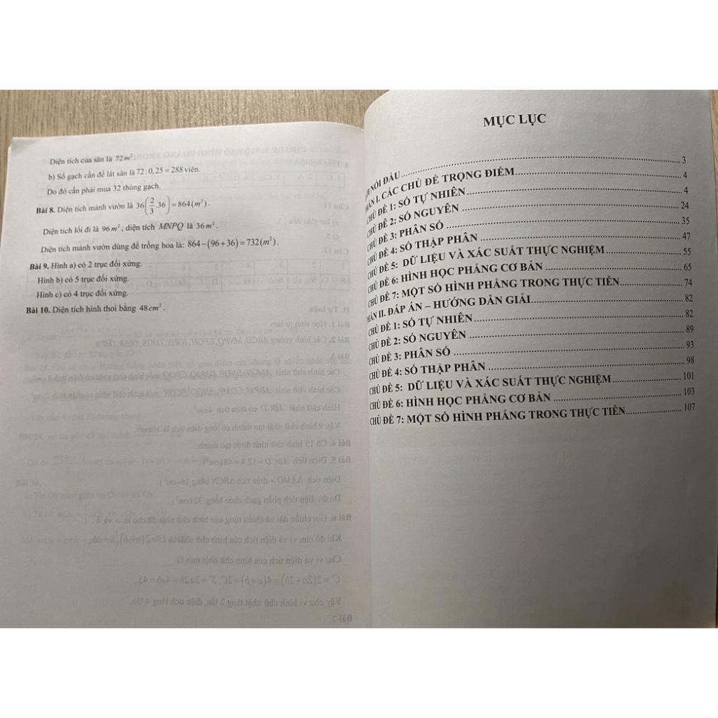 Phần 1: Các chủ đề ôn luyện. Phần này gồm 7 chủ đề ôn luyện ứng với các kiến thức chủ đạo của chương trình môn Toán lớp 6 mới. Mỗi chủ đề được chia thành ba mục: Phần kiến thức trọng tâm được tóm gọn, trình bày khoa học, giúp các em ghi nhớ , tái hiện, hiểu rõ hơn, sâu hơn về các đơn vị kiến thức; Các dạng bàu tập của từng chủ đề đi từ mức độ cơ bản đến mức độ nâng cao kèm theo hướng dẫn giải, giúp các em biết cách vận dụng giải quyết các nhiệm vụ học tập; Bài tập ôn luyện và củng cố bao gồm các câu hỏi được biên soạn dưới hình thức trắc nghiệm và tự luận.