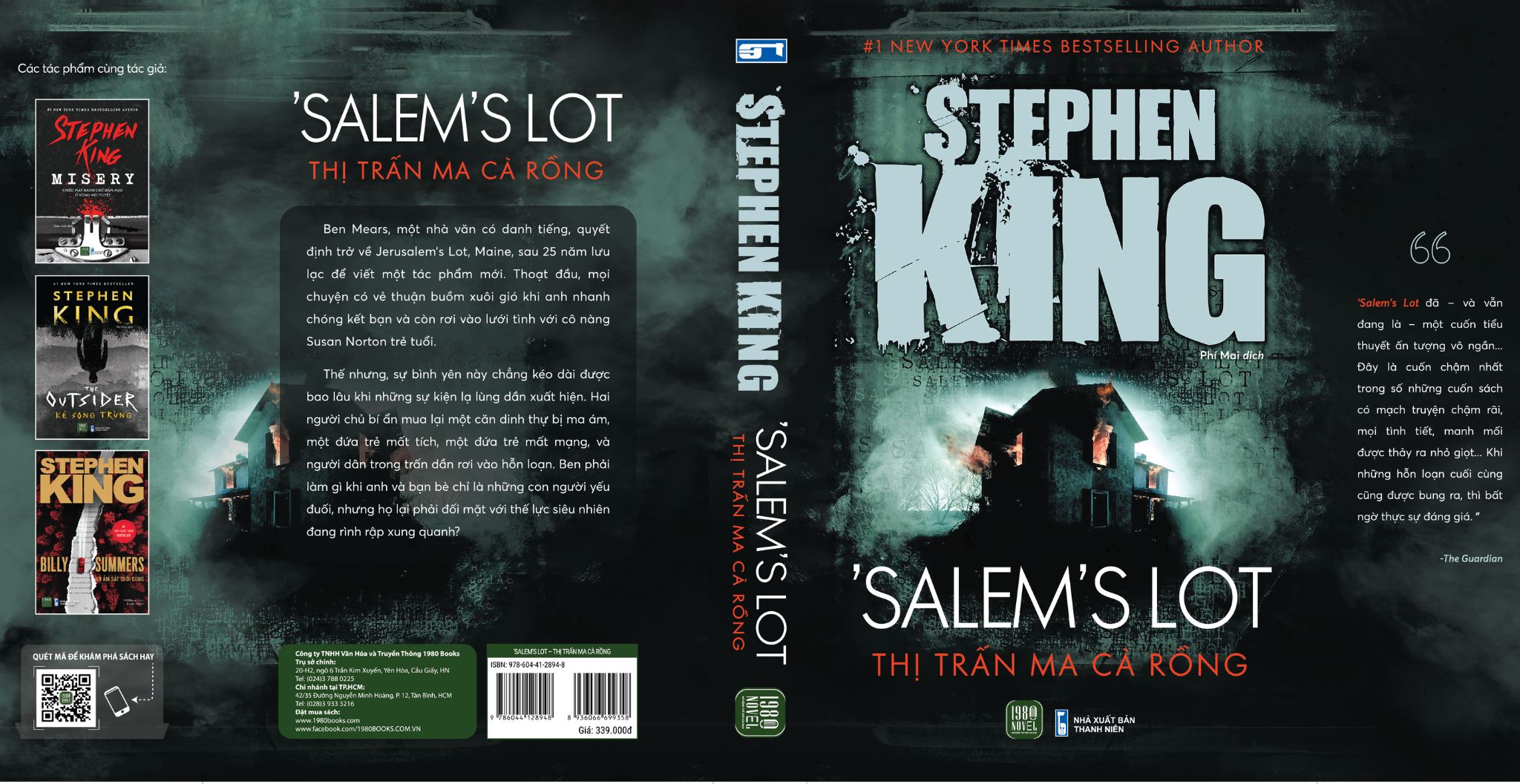 TÁC GIẢ: Stephen King Dịch giả: Phí Mai THÔNG TIN XUẤT BẢN: Giá bìa: 339.000đ Kích thước: 16x24 Số trang: 644 Mã EAN: 8936066699358 NXB liên kết: NXB THANH NIÊN Sách do Công ty TNHH Văn hóa và Truyền thông 1980 BOOKS ấn hành quý II/2024. SALEM’S LOT - THỊ TRẤN MA CÀ RỒNG Nội dung sách ‘Salem’s Lot kể về Ben Mears, một nhà văn có tiếng, trở về thị trấn Jerusalem’s Lot, Maine sau 25 năm và cố gắng viết cuốn sách tiếp theo của mình tại đây. Ben nhanh chóng kết bạn với người giáo viên Matt Burke và rơi vào lưới tình cùng cô nàng Susan Norton mới tốt nghiệp đại học. Ben trở lại thị trấn này để viết một tác phẩm về dinh thự Marsen, nơi anh từng trải qua một sự kiện kinh hoàng khi còn nhỏ. Anh bất ngờ phát hiện ra rằng căn dinh thự trên đã được bán cho hai người chủ bí ẩn mới, vì hiếm có ai lại muốn mua một căn biệt thự bỏ hoang và mang tiếng bị ma ám như vậy. Nhưng rồi những sự kiện kỳ lạ bắt đầu xảy ra, với một đứa trẻ mất tích và một đứa trẻ mất mạng. Mọi nghi ngờ đổ về căn dinh thự Marsen cùng hai người chủ mới đó. Khi người dân thị trấn dần rơi vào hỗn loạn, và Ben, Susan, Matt và vài người bạn khác tập hợp lại để chống trả. Nhưng vì họ chỉ là những con người yếu đuối, liệu họ có thể chống lại thế lực siêu nhiên đang kiểm soát ‘salem’s Lot hay không? Về tác giả: Nói đến thể loại văn học kinh dị, có lẽ không ai là không biết đến Stephen King, ông vua của thể loại này. Với hơn 350 triệu đầu sách được bán ra trên toàn thế giới với vô vàn giải thưởng lớn như National Medal of Art, British Fantasy Society Award… Stephen King đã trở thành ông hoàng sách kinh dị cũng như của các tác phẩm chuyển thể. Những tác phẩm của King không chỉ đem lại nỗi sợ hãi cá nhân cho người đọc mà còn xây dựng nên cả một nền văn hóa kinh dị cho thế giới. Ông là tác giả duy nhất có hơn 30 cuốn sách từng đứng đầu trong danh sách bán chạy nhất thế giới và cũng là người định nghĩa lại 3 cảm xúc chính trong mảng kinh dị là Kinh hoàng (Terror), Ghê rợn (Horror) và Khiếp sợ (Revulsion). Quan điểm người sáng tác có thể điều khiển tâm trí độc giả để tạo ra những cảm xúc sợ hãi khiến các tác phẩm của ông luôn thu hút được số lượng bạn đọc đông đảo. Những lời khen tặng: Được ra mắt và năm 1975, ‘Salem’s Lot nhanh chóng trở thành một trong những tác phẩm nổi tiếng và thành công nhất của Stephen King, nhanh chóng được chuyển thể thành phim và được giới phê bình công nhận. “’Salem’s Lot đã – và vẫn đang là – một cuốn tiểu thuyết ấn tượng vô ngần… Đây là cuốn chậm nhất trong số những cuốn sách có mạch truyện chậm rãi, mọi tình tiết, manh mối được thảy ra nhỏ giọt… Khi những hỗn loạn cuối cùng cũng được bung ra, thì bất ngờ thực sự đáng giá.