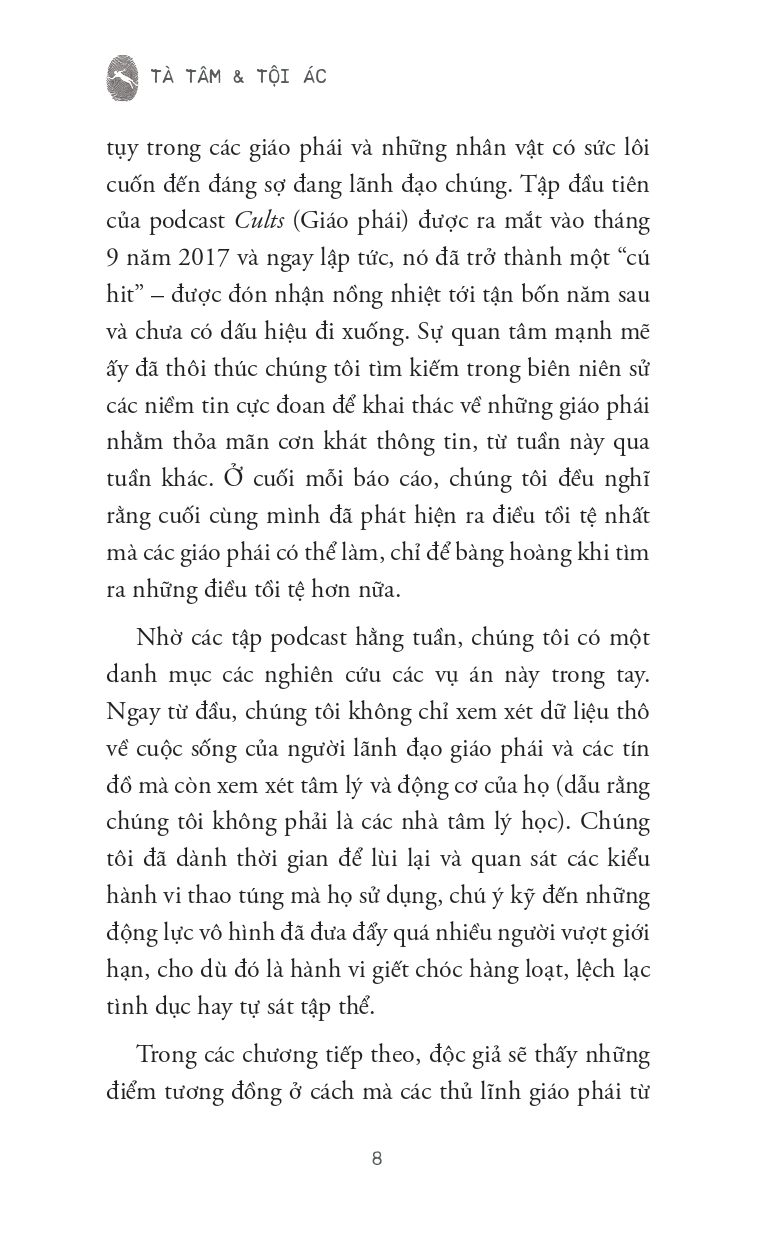Cuốn sách được xây dựng dựa trên loạt podcast nổi tiếng Cults của Parcast – một trong những podcast dẫn đầu về đề tài giáo phái và tội phạm tâm lý học. Dưới góc nhìn cận tâm lý học và kể chuyện điều tra, Max Cutler và Kevin Conley tái hiện từng chi tiết trong cuộc đời và hành vi của các nhân vật như Charles Manson, Jim Jones, Keith Raniere, David Koresh,… những cái tên khiến cả thế giới rúng động bởi sự tàn nhẫn và khát vọng quyền lực không giới hạn.