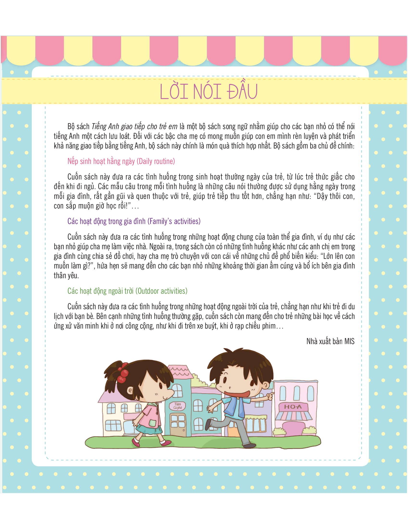 Sách Tiếng Anh Giao Tiếp Cho Trẻ Em - Daily Routines - Nếp Sinh Hoạt Hằng Ngày Mã sản phẩm: 8935212353991 Tác giả: MIS editorial team Dịch giả: Thùy Dương Độ tuổi: 3-9 tuổi Kích