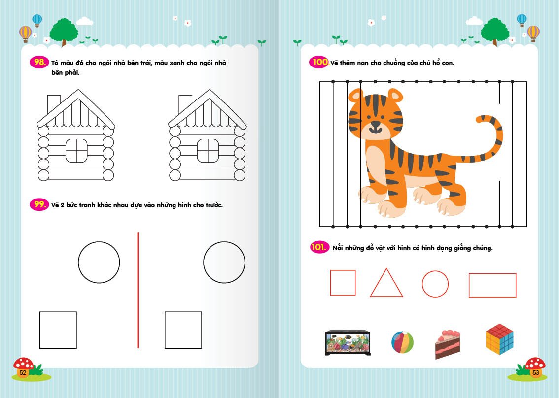vẽ vui nhộn. Các bài tập, trò chơi kết hợp giữa rèn luyện tư duy với kiến thức tự nhiên và xã hội mà trẻ đã quen thuộc như: mê cung, ghép hình, tìm quy luật chung… phù hợp nhận thức của trẻ từ 3 - 6 tuổi giúp các bé rèn luyện và phát triển các kĩ năng cần thiết: quan sát, tưởng tượng, sáng tạo, ghi nhớ, tư duy logic và giải quyết vấn đề,…