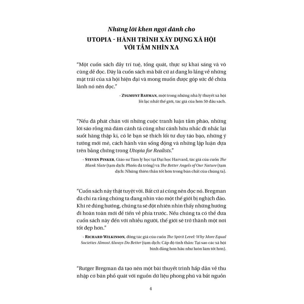 Utopia Hành Trình Xây Dựng Xã Hội Với Tầm Nhìn Xa là tác phẩm tràn đầy nhiệt huyết của một nhà sử học tài hoa, là ngôn ngữ đầy lương tri trong xã hội còn nhiều bất cập. Với phong cách viết sống động, linh hoạt, với các luận chứng, luận cứ xác đáng, đầy sức thuyết phục và với tư tưởng sắc bén, nhanh nhạy, Rutger Bregman đã tiến hành quan sát và phân tích những vấn đề trọng đại về sự phát triển của xã hội cũng như tương lai của nhân loại một cách hết sức mộc mạc mà thực tế. Cuốn sách nhận được đánh giá cao từ giới học thuật, giới trí thức, cũng như giới xuất bản - truyền thông. Đồng thời cuốn sách còn nhận được sự khẳng định và những lời giới thiệu rất nhiệt tình đến từ các học giả, tác giả đi trước. Điều này không hề khó hiểu bởi Rutger Bregman đã viết sách với quan điểm mới mẻ, lập trường sắc bén, văn phong độc đáo, cùng với đó còn bao hàm tinh thần chủ nghĩa lí tưởng và thái độ của chủ nghĩa hiện thực phê phán.