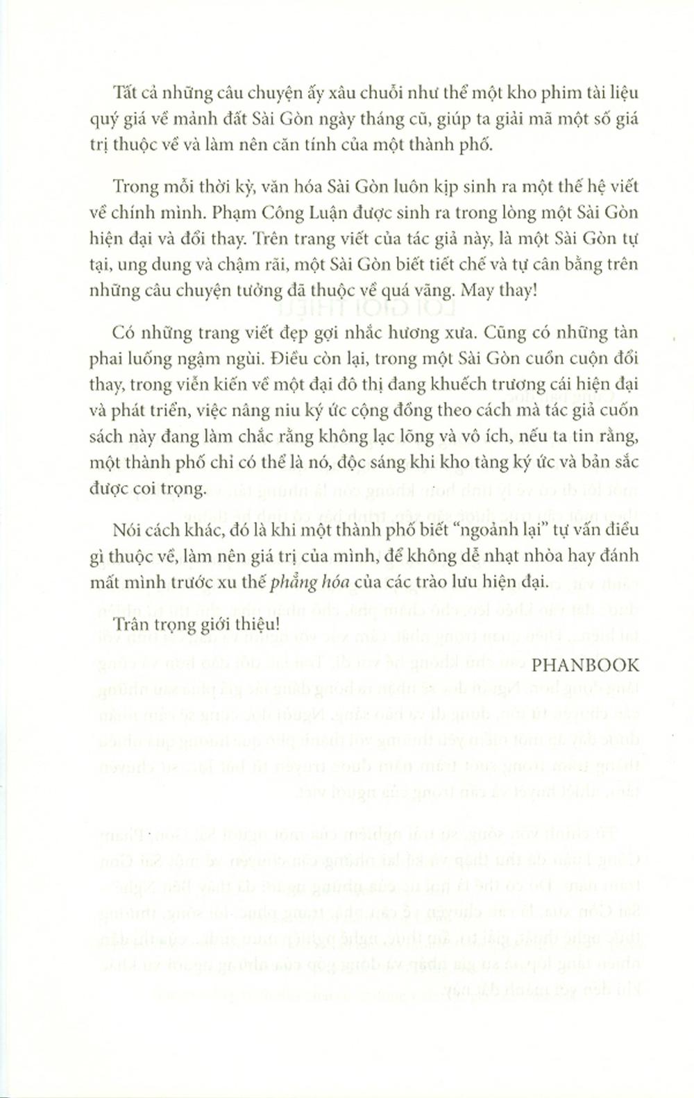 Từ chính vốn sống, sự trải nghiệm của một người Sài Gòn, Phạm Công Luận đã thu thập và kể lại những câu chuyện về một Sài Gòn trăm năm. Đó có thể là hồi ức của những người đã thấy Bến Nghé – Sài Gòn xưa, là câu chuyện về căn nhà, trang phục, lối sống, thưởng thức nghệ thuật, giải trí, ẩm thực, nghề nghiệp mưu sinh… của thị dân nhiều tầng lớp, là sự gia nhập và đóng góp của những người xứ khác khi đến với mảnh đất này.