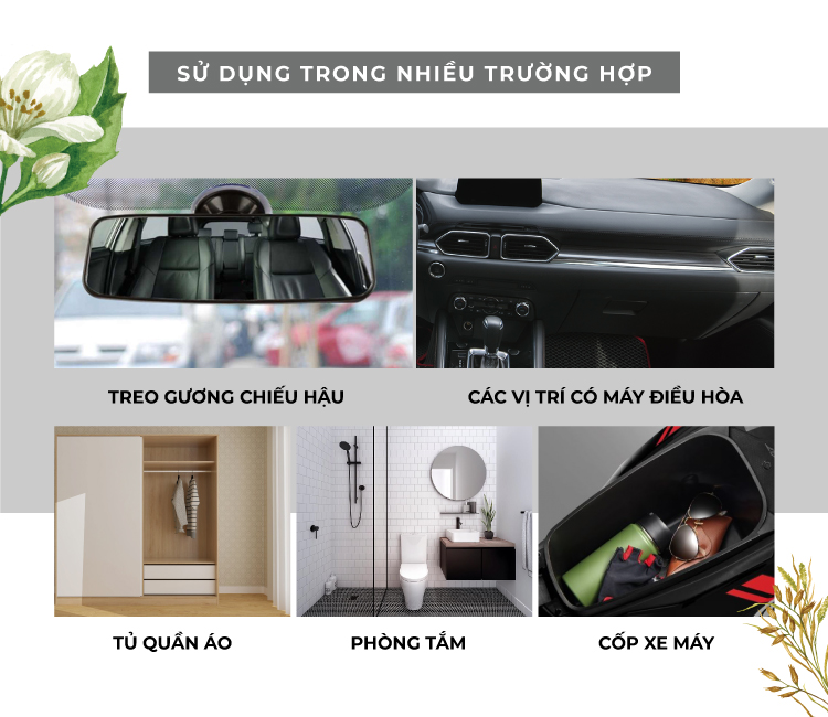 Sáp làm thơm không gian nội thất ô tô một cách nhanh chóng, khiến tinh thần sảng khoái hơn và tránh say xe. Các nguyên liệu chiết xuất hoàn toàn từ thiên nhiên, được nhập