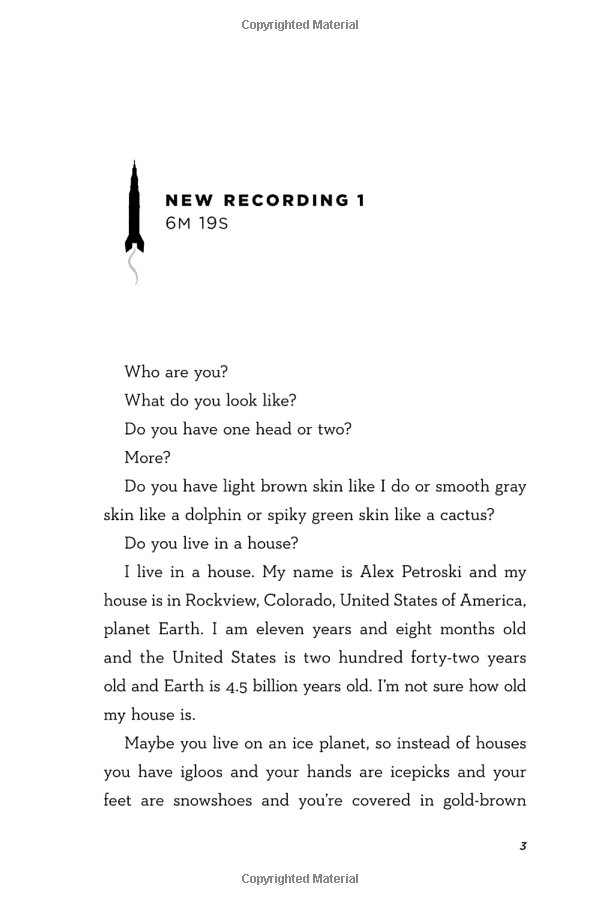 11-year-old Alex Petroski loves space and rockets, his mom, his brother, and his dog Carl Sagan--named for his hero, the real-life astronomer. All he wants is to launch his golden iPod into space the way Carl Sagan (the man, not the dog) launched his Golden Record on the Voyager spacecraft in 1977. From Colorado to New Mexico, Las Vegas to L.A., Alex records a journey on his iPod to show other lifeforms what life on earth, his earth, is like. But his destination keeps changing. And the funny, lost, remarkable people he meets along the way can only partially prepare him for the secrets he'll uncover--from the truth about his long-dead dad to the fact that, for a kid with a troubled mom and a mostly not-around brother, he has way more family than he ever knew.