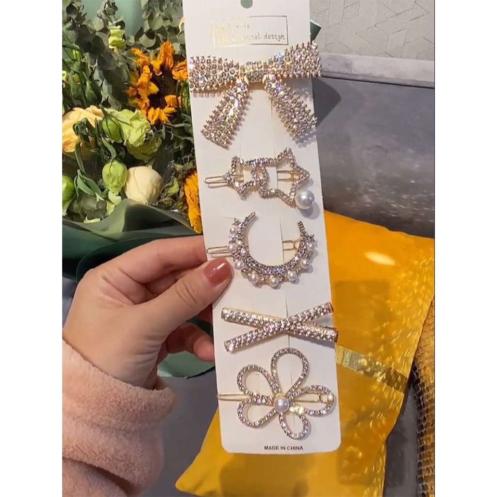 PVN27023 Sét 5 Kẹp tóc đính đá lấp lánh nơ và hoa phong cách Hàn quốc