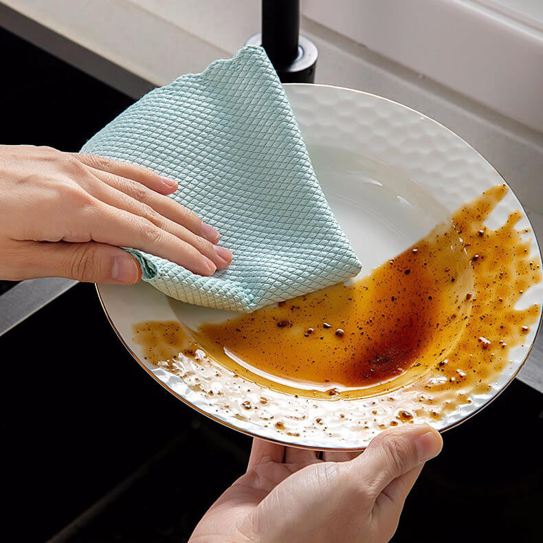 Khăn Lau Bếp Đa Năng Vải Da Cá được làm từ sợi Superfine Fiber, độ thấm hút nước cao, không để lại vệt nước hay vệt lau trên bề mặt. Sợi Superfine Fiber còn có