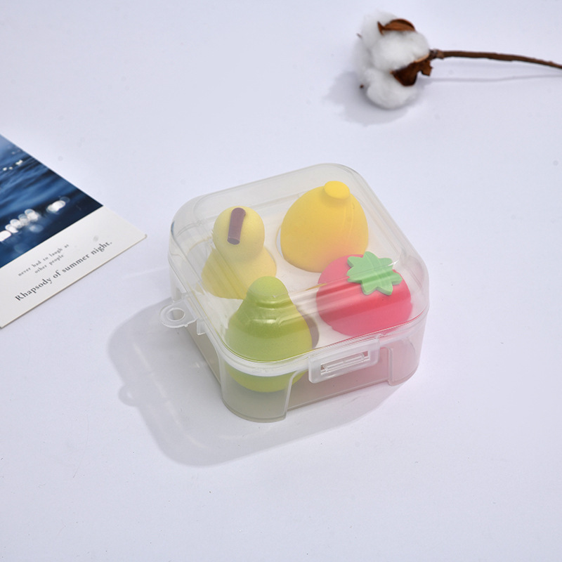 -Mút trang điểm 4 món hình quả trứng trái cây , bông tán phấn nhiều màu có hộp đựng , xinh xắn siêu đáng yêu cute -Xuất xứ : Trung Quốc -Chất liệu : cao