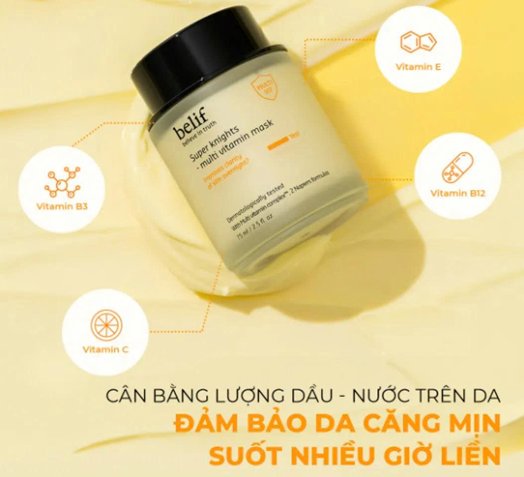 Mặt nạ ngủ Belif Multi Vitamin Mask cho làn da bừng tỉnh, ẩm mượt đầy sức sống nhờ được “sạc nhanh” 4 loại vitamin và cấp nước chuyên sâu chỉ sau một đêm. Thành phần