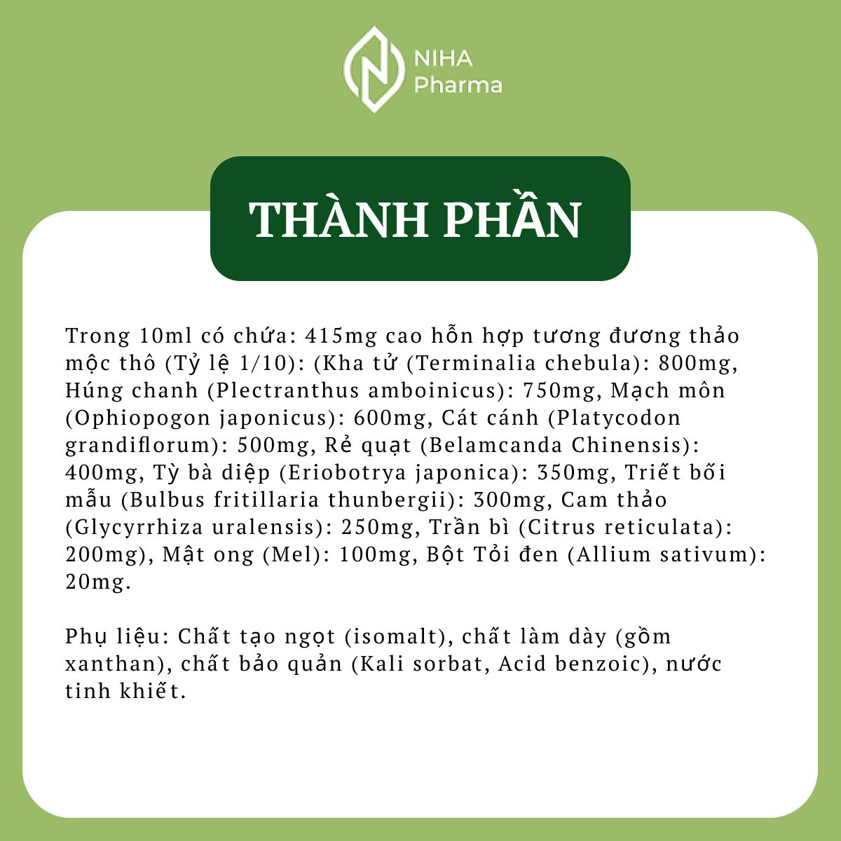 Trong 10ml có chứa: 415mg cao hỗn hợp tương đương thảo mộc thô (Tỷ lệ 1/10): (Kha tử (Terminalia chebula): 800mg, Húng chanh (Plectranthus amboinicus): 750mg, Mạch môn (Ophiopogon japonicus): 600mg, Cát cánh (Platycodon grandiflorum): 500mg, Rẻ quạt (Belamcanda Chinensis): 400mg, Tỳ bà diệp (Eriobotrya japonica): 350mg, Triết bối mẫu (Bulbus fritillaria thunbergii): 300mg, Cam thảo (Glycyrrhiza uralensis): 250mg, Trần bì (Citrus reticulata): 200mg), Mật ong (Mel): 100mg, Bột Tỏi đen (Allium sativum): 20mg.