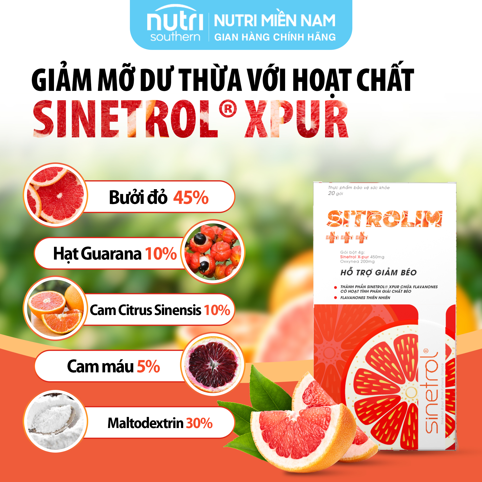 SINETROL XPUR (Chiết xuất bưởi đỏ Grapefruit (45%), Chiết xuất hạt Guarana (10%), Chiết xuất cam Citrus Sinensis (10%); Chiết xuất cô đặc Cam máu Blood Orange (5%); Maltodextrin (từ tinh bột ngô) (30%)) 450 mg