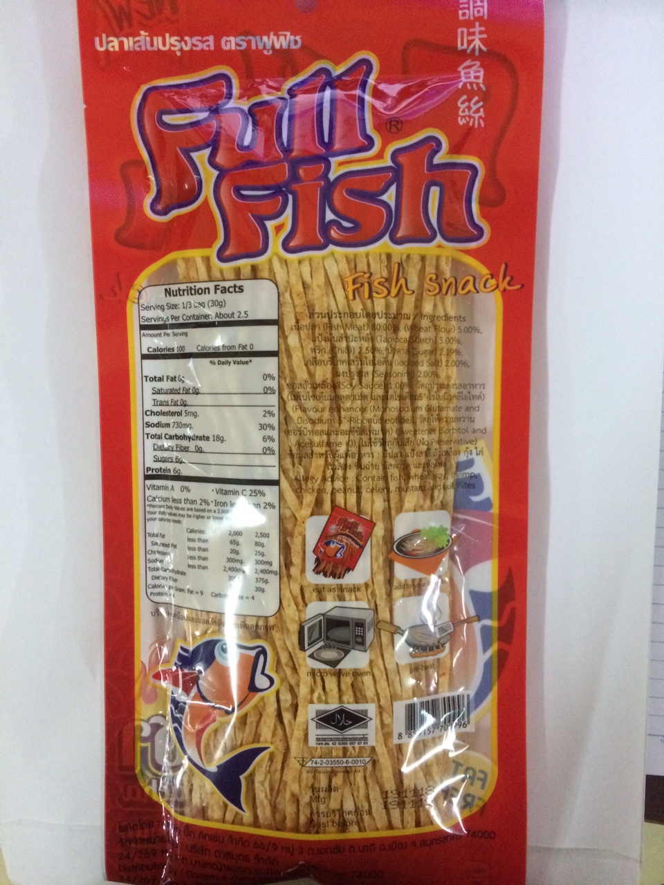 HSD: 12 tháng Xuất xứ: Thái Lan Đặc điểm sản phẩm: Snack cá sợi Full Fish có nguyên liệu chính là những lát cá tươi, được nướng và cắt thành những sợi dài, mảnh.  Có thể dùng làm món ăn nhẹ giữa buổi, “nhâm nhi” những khi đang tán gẫu cùng bạn bè, khi xem phim, khi ngồi đọc sách, thư giãn… Đặc biệt, đây còn là một loại nguyên liệu kèm theo khi chế biến các món ăn khác như mì gói, salad trộn… Sản phẩm có thể thưởng thức ngay chứ không cần qua chế biến.  Những ai thích vị giòn tan thiệt “đã”, có thể bỏ snack vào lò vi sóng tầm khoảng 2-3 phút, ở nhiệt độ 80-200oC.  Ngoài ra, sản phẩm còn có thể chiên cùng dầu nóng.  Snack cá sợi Full Fish được chế biến và đóng gói đạt chuẩn, đã qua nhiều quy trình kiểm định  Snack cá sợi FullFish được làm từ cá biển nguyên chất lên đến 80% thịt cá, protein, hoàn toàn không chứa Cholesterol, an toàn cho người lớn và trẻ em. "