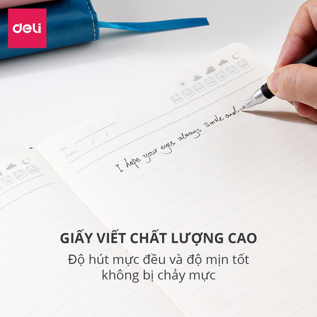 Sổ tay ghi chép A5 Bìa Da Deli TÍNH NĂNG SẢN PHẨM: ️Bìa chất liệu da PU cao cấp, chống nước, màu sắc tươi sáng ️Lõi giấy 80 và 100 gsm dày dặn, viết trơn