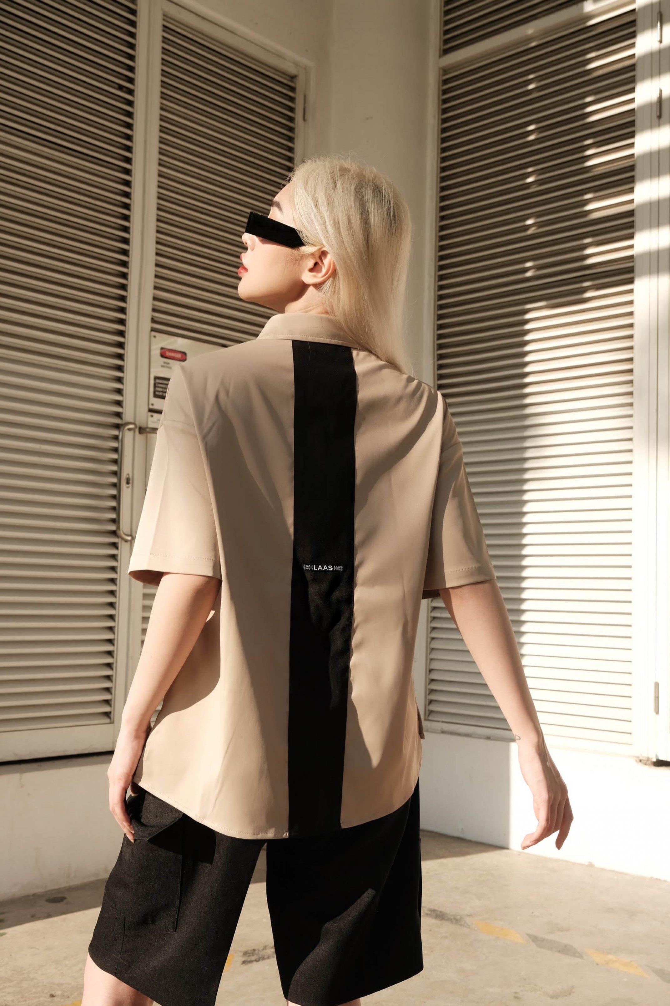 ĐIỂM PHẤN PHẦN PHỐI KẺ SỌC GIỮA TRƯỚC NẸP ÁO, VÀ GIỮA SAU THÂN ÁO PHÍA SAU PHẦN PHỐI SỌC CÓ GẮN TAG LOGO LAAS