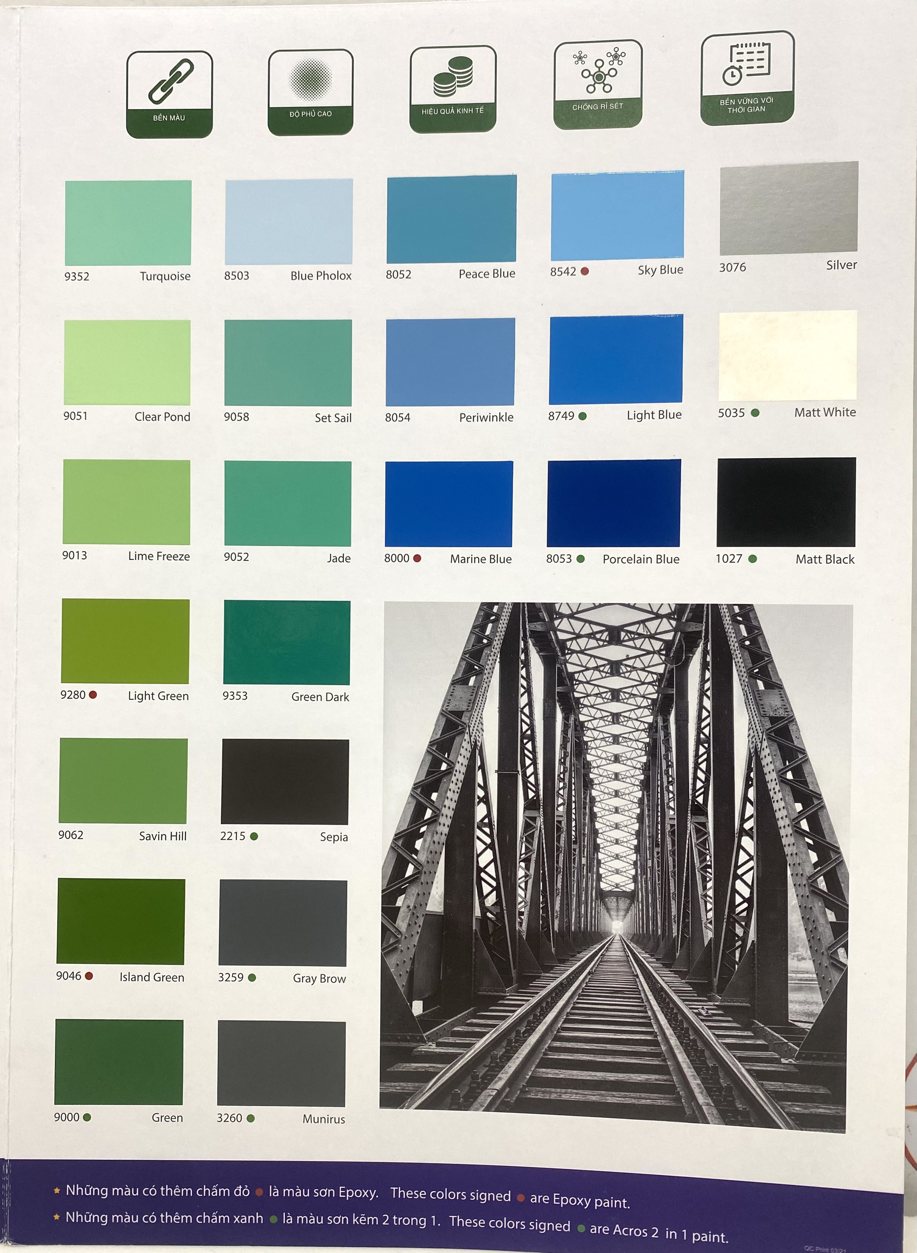 Dễ sử dụng khi thi công. Mã sản phẩm: DLF 1xxx: Đen - DLF 2xxx: Đỏ - DLF 3xxx: Ghi - DLF 4xxx: Tím DLF 5xxx: Trắng pha - DLF 6xxx: Vàng tone nghệ - DLF 7xxx: Vàng tone đất - DLF 8xxx: Xanh tone Blue - DLF 9xxx: Xanh tone Green Mã màu sơn dầu: vàng kem 7079 peaceful white;  6068 creamy; 7053 lily; 7052 tiffany powder; vàng 6000 reddish yellow; 9254 varut; 7055 muffin; 6053 coffee crunch; 6055 pumpkin; 6301 golden honey; xám 3106 pastel grey; 3040 light grey; 3039 moonless; 3062 light grey; 3000 weatherbell; 3041 silent blue; 8051 pacific blue; 8503 blue phlox; 9062 savin hill; 9000 green; 8052 peace blue; 8054 periwinkle; 8055 legend blue; 8053 porcelain blue; xanh dương 8000 marine blue; 9051 clear pond; 9013 lime freeze;9058 set sail; 9052 jade; 9055 spruce; 9255 antique; 2059 brown; 2057 russet; 2021 red fly; 2054 ruby red; 3076 silver; đen mờ 1027 matt black; màu trắng mờ  matt white 5035; màu xanh 8519 matt blue; 6170 lemon yellow, 6105 medium yellow,3114 silver grey, 3071 Whea ther vane, 3258 Banff blue, 3040 Yellow grey,1065 Black metal, 2213 Orange Bedder, 2098 Orange vermillion, 9352 turquoise, 9280 Light green,9046 island green, 9353 green dark,2215sepia, 3259 gray brown, 3260 munirus, 8542 sky blue, 8749 light blue, 3076 silver Thông số: