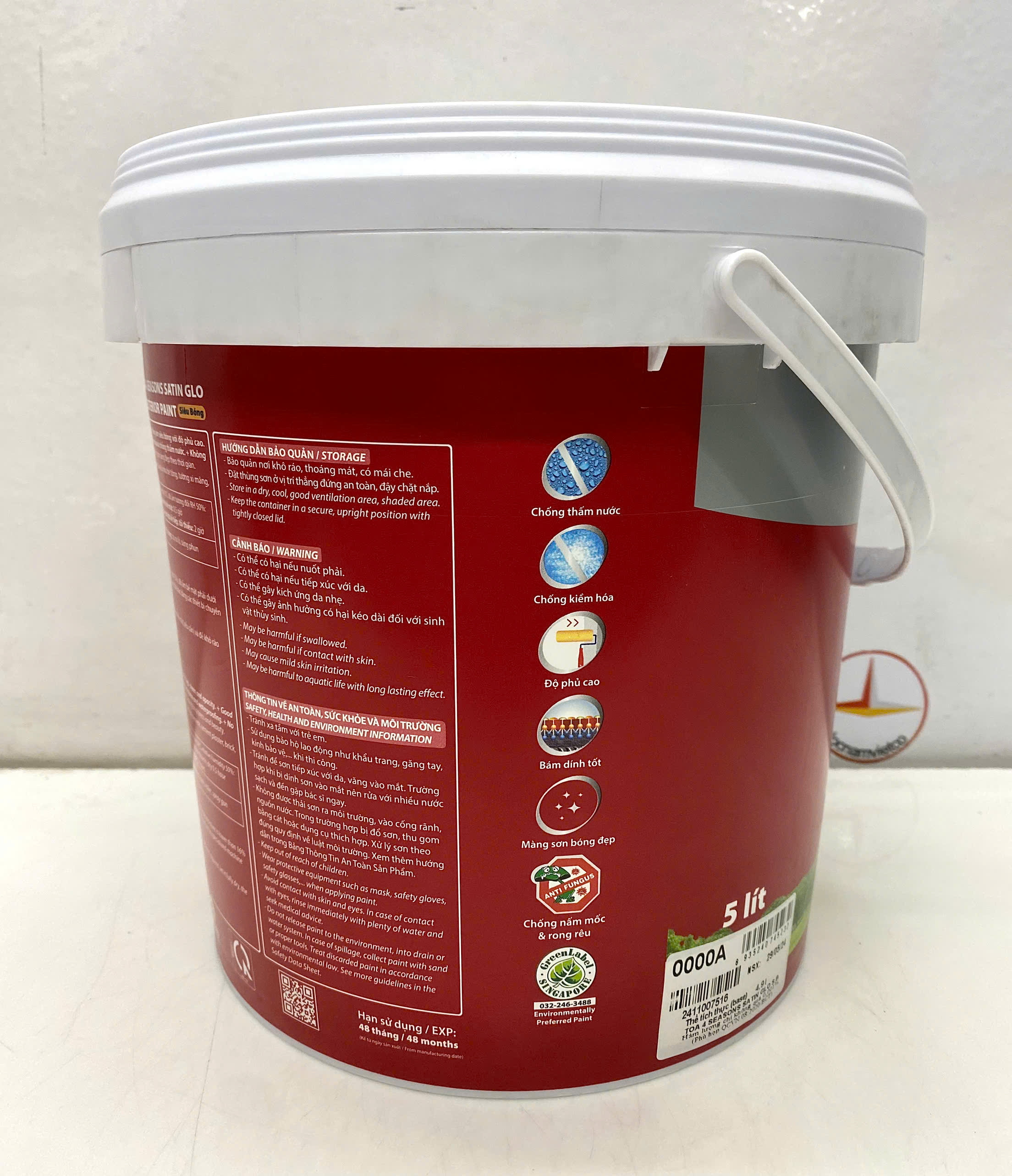 Mua tại TiktokSơn nước ngoại thất cao cấp TOA 4 Seasons Satin Glo siêu bóng màu vàng 8522 _ 5L Sơn nước ngoại thất cao cấp TOA 4 Seasons Satin Glo siêu bóng là sơn nước dành cho ngoài trời, được sản xuất từ nhựa nhũ tương Acrylic với các ưu điểm màng sơn bóng với độ phủ cao, khả năng chống chịu tốt với điều kiện thời tiết khắc nghiệt: bền màu, chống phấn hóa, chống rong rêu nấm mốc, chống phai màu. Ưu điểm: