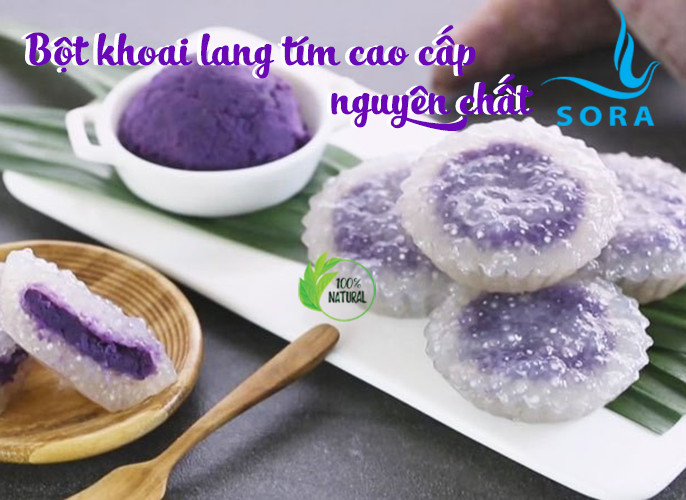 Với màu sắc bắt mắt và hương vị thơm ngon, khoai lang tím trở thành món ăn dân dã của nhiều gia đình. Đây là thực phẩm có nguồn gốc từ Nam Mỹ, họ hàng xa với cây khoai mỡ và khoai tây.Khoai lang tím giàu kali, tinh bột, axit amin, vitamin, chất xơ, nhiều nguyên tố vi lượng nên có nhiều lợi ích về mặt sức khỏe.      Khoai lang tím trở thành món ăn dân dã của nhiều gia đình.Khoai lang tím, có phần “thịt” màu tím mờ đến tím sẫm, rất giàu protein, 18 loại axit amin tốt cho tiêu hóa, 8 loại vitamin A, B,C và phốt pho, sắt cùng với hơn 10 loại hóa chất tự nhiên khác.    Khoai lang tím lâu nay được biết rất có ích trong việc giúp cơ thể chống lại sự mệt mỏi và tốt cho máu, có thể thúc đẩy quá trình thải độ, cải thiện hệ tiêu hóa, phòng ngừa các bệnh dạ dày và đường ruột, ngừa bệnh ung thư. Và trong nghiên cứu trên của các nhà khoa học Mỹ, khoai lang tím còn được phát hiện ra rằng có khả năng tiêu diệt và ngăn chặn được các tế bào ung thư lây lan.    Sora bột khoai lang tím cao cấp nguyên chất là sản phẩm được sản xuất với công nghệ và quy trình hiện đại, mang đến cho người tiêu dùng sản phẩm sạch, chất lương, an toàn và hợp vệ sinh, không tạp chất, không chất bảo quản, không hương liệu, phẩm màu. Bột khoai lang tím Sora có màu từ tím nhạt đến tím đậm tùy theo tư từng đợt khoai và mùa vụ.
