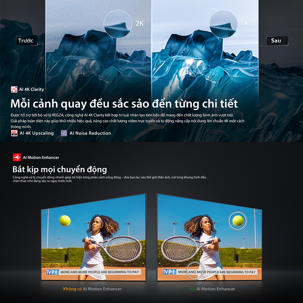 Hình ảnh hiển thị sắc nét, sống động với độ phân giải 4K trên màn hình 55 inch vừa vặn cho không gian vừa. Tăng cường độ chi tiết và độ rõ nhờ công nghệ