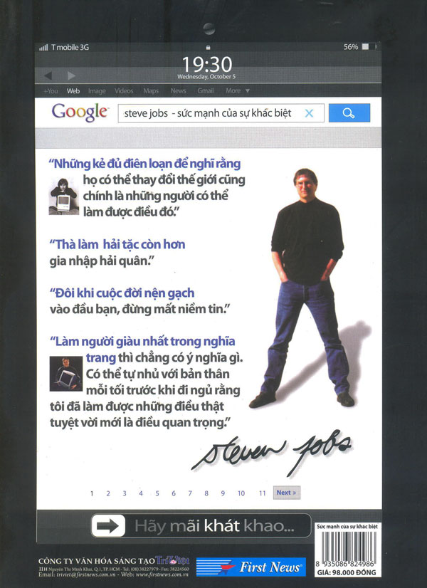 Cuốn sách “Steve Jobs – Sức mạnh của sự khác biệt” được thực hiện bởi một nhóm người Việt say mê công nghệ thông tin. Lấy ý tưởng từ chiếc Ipad, trang bìa ấn tượng của cuốn sách có đầy đủ các Icon thú vị. Từ cột sóng 3G mà ngày nay đã quá phổ biến với tín đồ công nghệ đến nút nhấn duy nhất đã làm thay đổi cả nền thông tin di động trên thế giới, slide trượt quen thuộc mời độc giả “mở để đọc”. Các con số đều ẩn chứa thông điệp đặc biệt, 19h:30 Wednesday 5 October đúng là giờ phút định mệnh thế giới mất đi thiên tài công nghệ thông tin. Cột pin dừng lại ở 56% - số tuổi tung hoành trên trần thế của “chàng lãng tử” ngang ngược Steve Jobs.