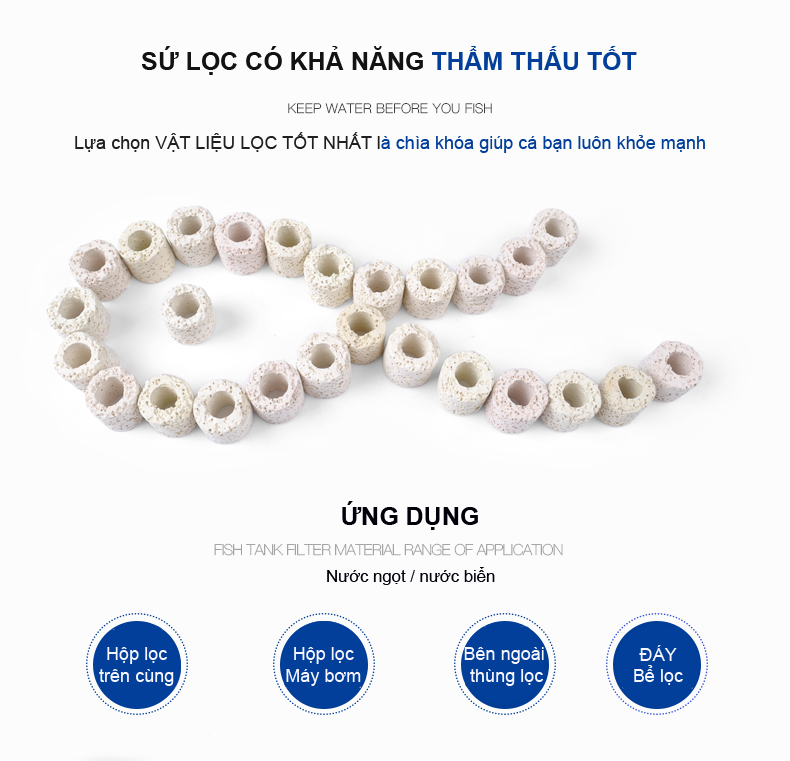 Đặc điểm: sứ lọc là sản phẩm vật liệu lọc bể cá cực kỳ phổ biến, có thể nói xếp ngang với sứ thanh hoa mai Keyrsin. Sứ viên lỗ vi sinh thường sử dụng cho lọc tràn trên, lọc ngoài, các bộ lọc chế thùng kín. Phân tán dòng tốt, diện tích bề mặt lớn, giá thành hợp lý nên sứ viên rất được người chơi thủy sinh sử dụng.