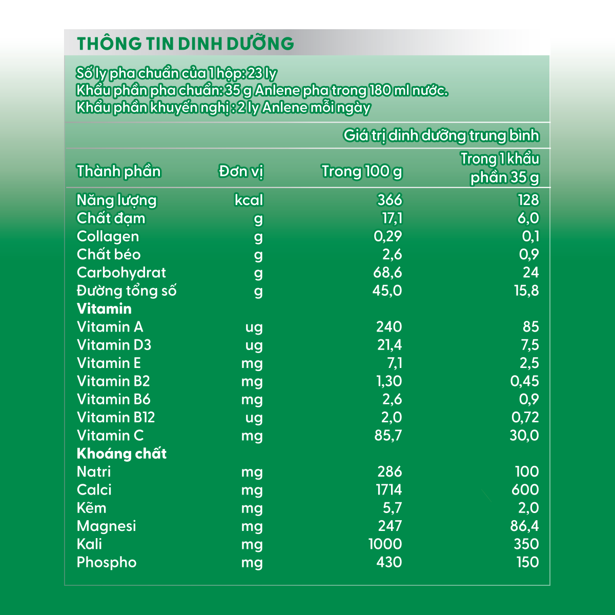 SỮA ANLENE HƯƠNG VANISản phẩm sữa cho người lớn tuổi (từ 30 tuổi trở lên) với HỆ DƯỠNG CHẤT BONEMAX chứa hàm lượng cao: • Đạm • Canxi • Collagen • Các loại Vitamin (B, C, D) • Khoáng chất