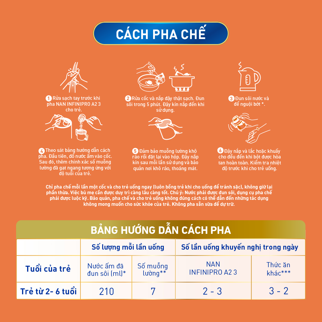 Tên sản phẩm: Sản phẩm dinh dưỡng công thức Nestlé NAN INFINIPRO A2 3 800g Xuất xứ: Thụy Sĩ Khối lượng tịnh: 800g/lon Độ tuổi phù hợp: 2 - 6 tuổi Thành phần: SỮA A2 tách kem 29% (A2 Skimmed MILK powder), LACTOSE (từ SỮA-from MILK), WHEY khử khoáng (từ SỮA-WHEY PROTEIN from MILK), Hỗn hợp dầu (dầu hướng dương giàu acid Oleic, dầu hạt cải có hàm lượng acid Erucic thấp, dầu hướng dương, dầu nấm Mortierella alpina, dầu vi tảo Schizochytrium sp., chất chống oxy hóa (Tocopherol concentrat dạng hỗn hợp, Ascorbyl palmitat)), Các vitamin (C, E, Nicotinamid, B5, B1, A, B6, B2, Acid folic, K1, Biotin, D3, B12), Các khoáng chất (Calci citrat, Natri citrat, Dikali hydro phosphat, Magnesi Clorid, Sắt (II) sulphat, Kali citrat, Kẽm sulfat, Đồng sulfat, Mangan sulfat, Kali iodid, Natri selenat), Oligosaccharide (3-Fucosyllactose, 2'-Fucosyllactose, Lacto-N-tetraose, 3'-Sialyllactose, 6'-Sialyllactose, Difucosyllactose), Maltodextrin, Chất nhũ hóa Lecithin ĐẬU NÀNH (SOYA lecithin), Choline bitartrate, Taurine, Chất điều chỉnh độ acid Natri hydroxyd, Inositol, Lợi khuẩn (Bifidobacterium longum subsp. infantis, Bifidobacterium lactis), Nucleotide (Cytidine, Uridine, Adenosine, Guanosine), Chất điều chỉnh độ acid Acid citric, L-carnitine. () có chứa LACTOSE (contain LACTOSE) Cảnh báo: Không sử dụng cho trẻ bị dị ứng với các thành phần của sản phẩm. Nên có sự hướng dẫn của bác sĩ trước khi dùng đối với trẻ không dung nạp đường lactose. Cách pha chế: