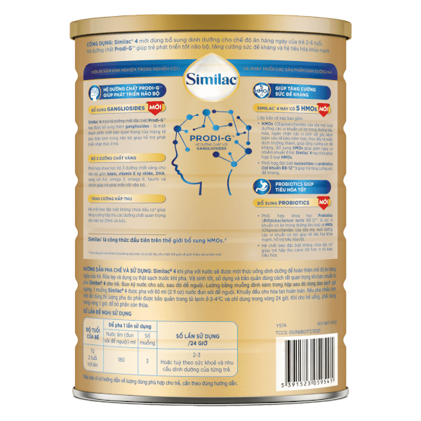 - Đậy nắp kín và bảo quản nơi khô mát (không để trong tủ lạnh). Cách pha chuẩn Mỗi muỗng gạt ngang bột Similac 4 pha với 60 ml (2 fl oz) nước hoặc 152,0 g bột pha với nước thành 1 lít. Lưu ý