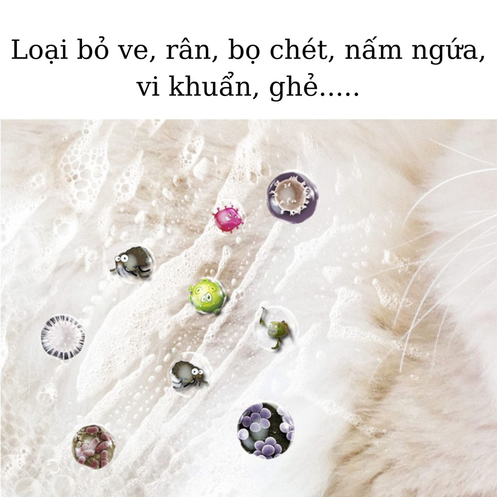 - Sữa Tắm Chó Mèo Trị Ve Ghẻ, Bọ Chét, Rận Tai Bio (500ml) tác động nhẹ dịu lên da thú cưng, giúp giải quyết các vấn đề về da như gàu, bã nhờn và