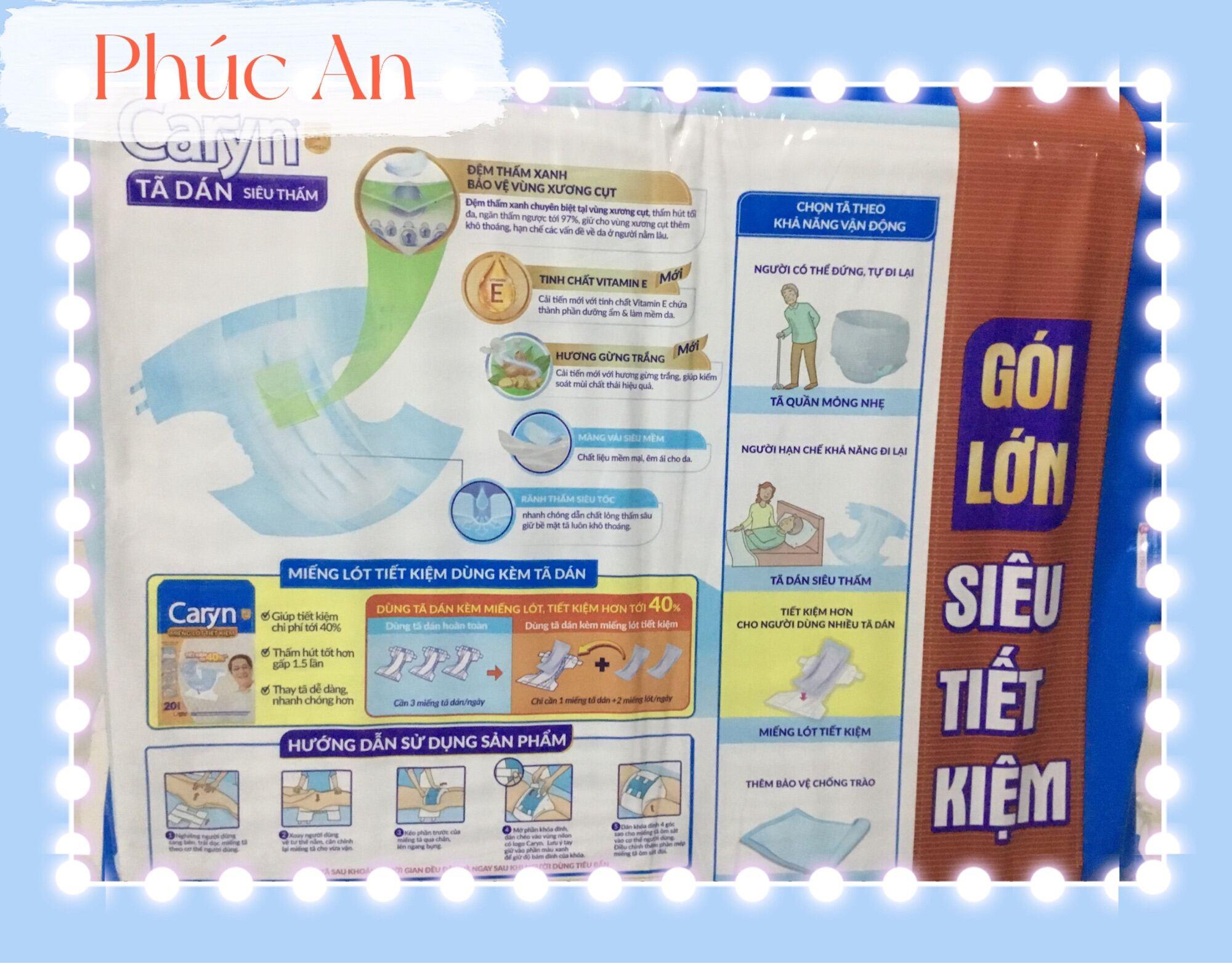 Mô Tả Sản Phẩm Tã Dán người lớn Caryn Gói Lớn Tã dán Siêu thấm Caryn cải tiến mới với “Đệm thấm xanh" chuyên biệt tại vùng xương cụt, với các hạt thấm hút tăng