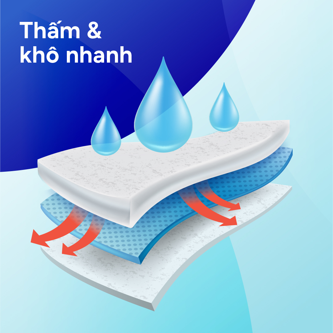 Lớp dẫn thấm thông minh (ADL) Giúp lan toả, phân tán đều chất lỏng, thấm hút siêu tốc và ngăn chất lỏng thấm ngược. Hạt GEL tác động kép thấm hút - kháng khuẩn