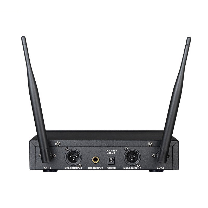 • Sử dụng sóng không dây UHF cho kênh tần số chính xác và hiệu suất đáng tin cậy, ăng ten kép cho phạm vi hoạt động ổn định trong 100m (không vật cản).