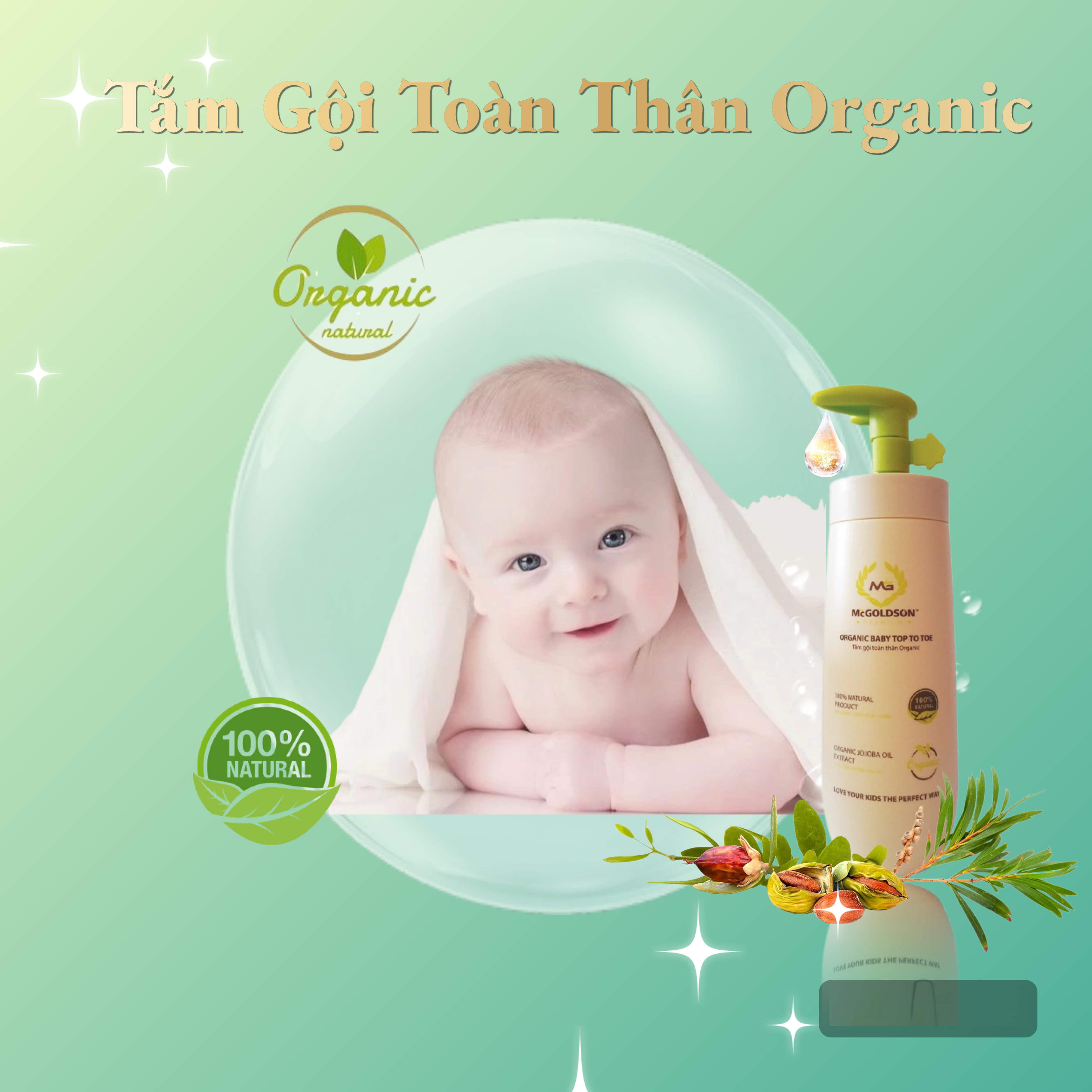 - Tắm gội toàn thân Organic sử dụng các thành phần dịu nhẹ có nguồn gốc hoàn toàn 100% thiên nhiên , không gây cay mắt, an toàn với làn da mỏng manh, nhạy cảm của trẻ nhỏ. Sự kết hợp giữa Tinh chất jojoba hữu cơ với Tràm trà giúp làm sạch, mềm, mịn da và tóc, hạn chế sự mất nước giảm viêm da, ngừa hăm và rôm sảy.