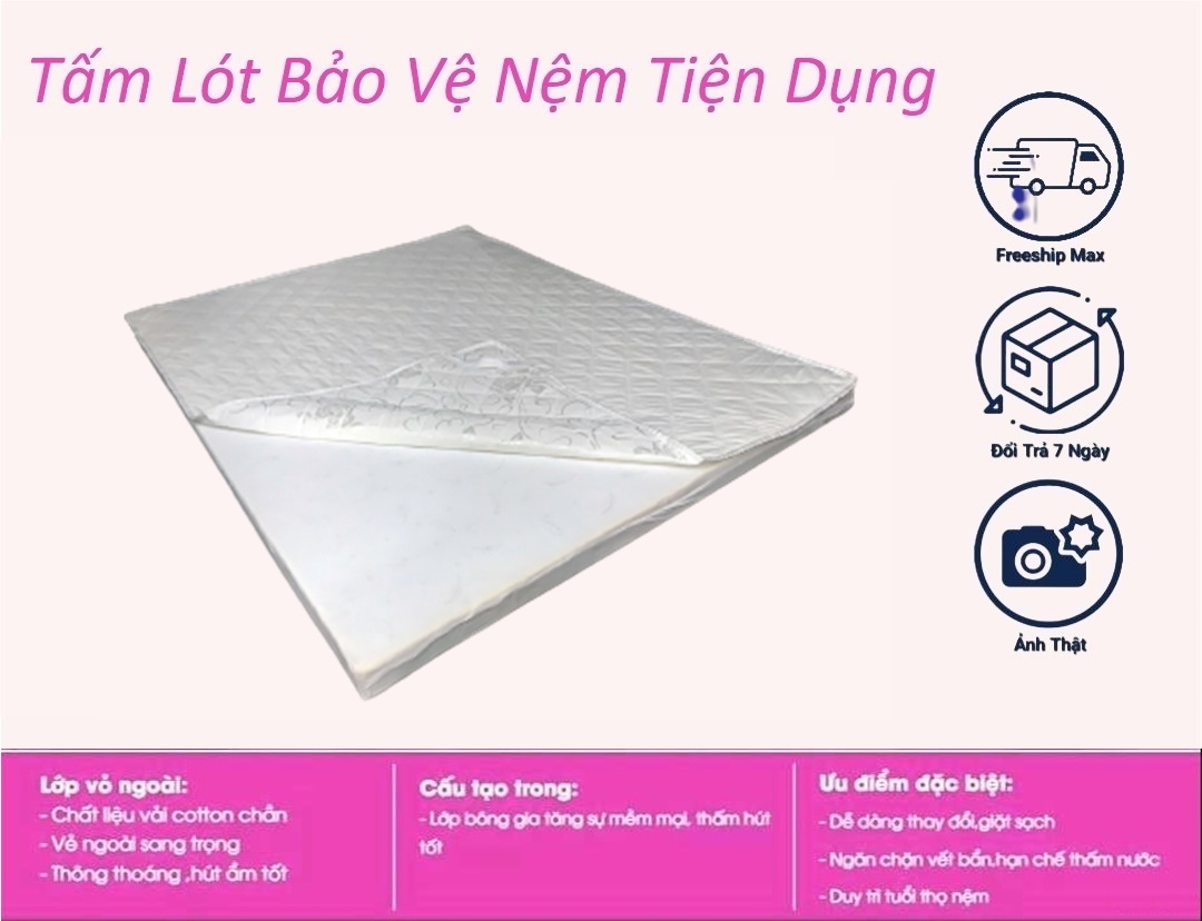 Mô tả chi tiết Lựa chọn tấm bảo vệ nệm có kích thước tương ứng với nệm. Kích thước tiêu chuẩn:1m2x2m; 1m4x2m; 1m6x2m; 1m8x2m; 2mx2m Cấu trúc 3 lớp: 2 lớp ngoài là vải Poly