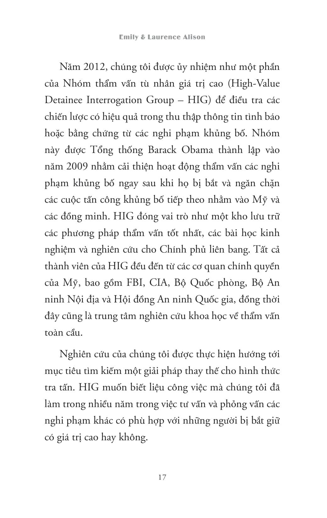 Laurence và Emily Alison là hai nhà lãnh đạo thế giới trong lĩnh vực tâm lý học pháp y, tư vấn và đào tạo cho các cơ quan cảnh sát, an ninh, FBI và CIA về cách đối phó với những kẻ tình nghi cực kỳ nguy hiểm. Sau 30 năm làm việc – với hơn 2000 giờ thẩm vấn các nghi phạm khủng bố – họ đã phát triển được một mô hình giao tiếp liên nhân vô cùng đột phá.