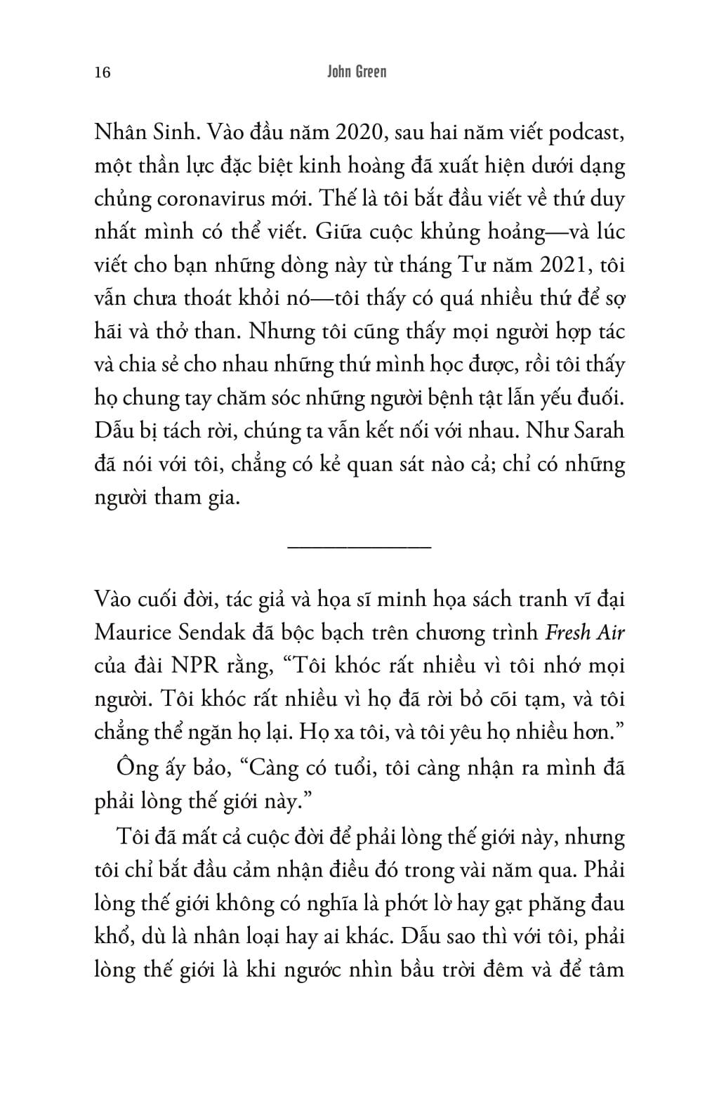 Các bài viết trong "Đánh giá kỷ nhân sinh" một lần nữa cho thấy tài kể chuyện hiếm có của John Green. Tác phẩm là cuộc hành trình khám phá đầy cảm hứng về những con đường mà chúng ta đã khai mở, đồng thời là một lời tụng ca chân thành về tình yêu dành cho thế giới.