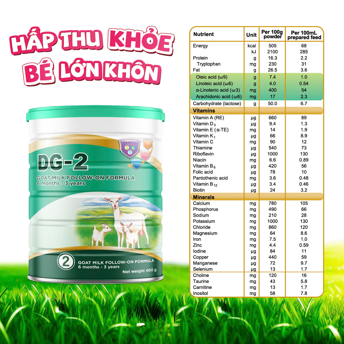 SỮA DÊ CÔNG THỨC DG-2 GOAT MILK FOLLOW-ON FORMULAChú ý: Sữa mẹ là thức ăn tốt nhất cho sức khỏe và sự phát triển toàn diện của trẻ nhỏ. Các yếu tố chống nhiễm khuẩn, đặc biệt là kháng thể chỉ có t...