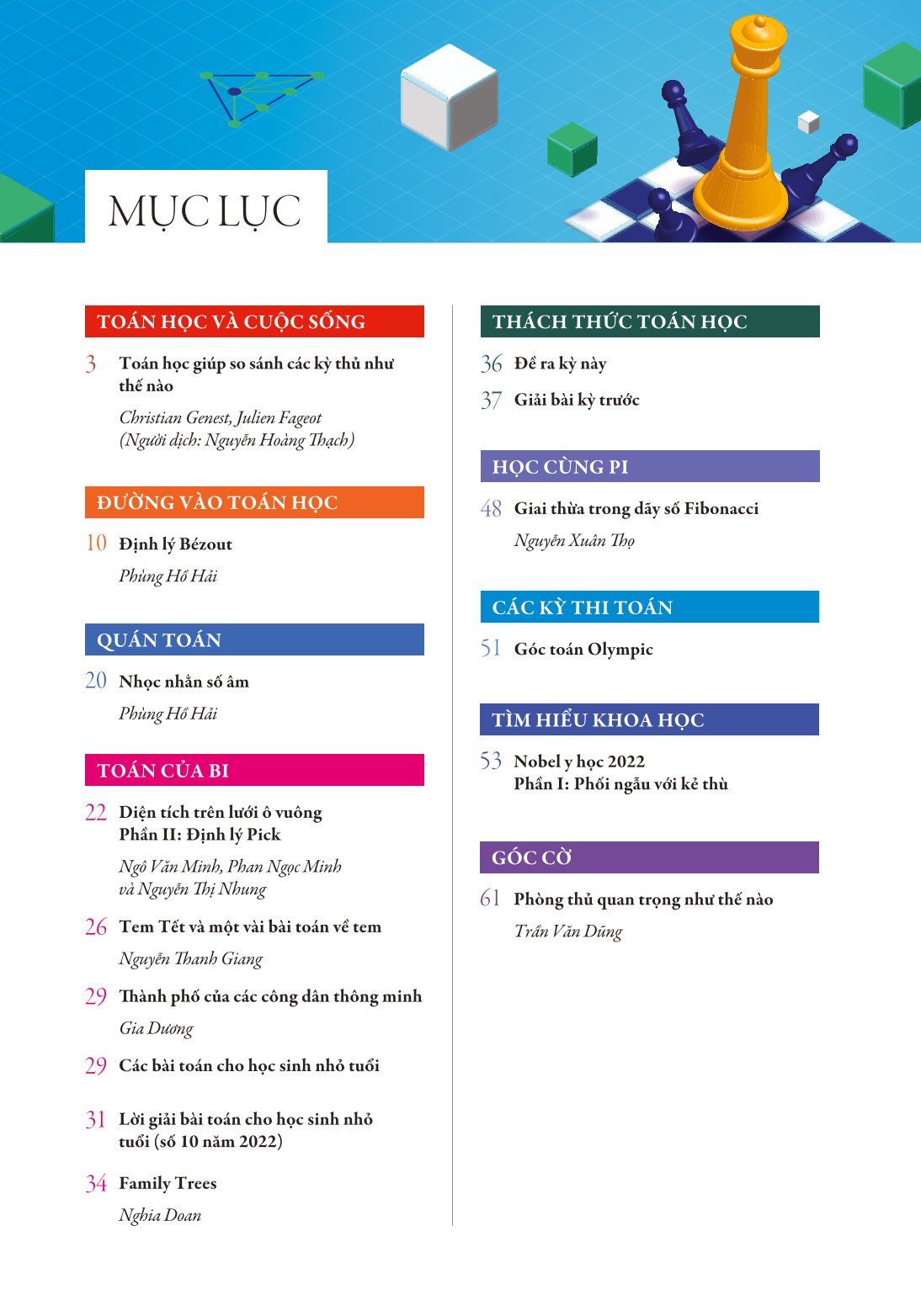 • Đời sống Toán học: Những tin tức quan trọng về các hoạt động Toán học mới diễn ra.   ĐỘC GIẢ HỌC SINH, SINH VIÊN, GIÁO VIÊN + Toán của Bi: Chuyên mục dành cho các em nhỏ và cả những người ở mọi lứa tuổi nhưng vẫn mang tâm hồn trẻ thơ. Nội dung gồm những bài toán thường thức, các trò chơi toán học. Người đọc dễ dàng cảm nhận và được thu hút vì những kiến thức để giải toán rất phổ thông, gần gũi với đời sống. Khi các bạn trẻ “chạm vào toán” là khi các bạn tìm thấy sự tự tin của chính mình. Chuyên mục cũng phù hợp với các giáo viên tiểu học hay các bậc cha mẹ học sinh muốn đồng hành cùng con qua các thử thách nho nhỏ! + Học cùng Pi: Chuyên mục giúp các bạn học sinh học toán tốt hơn thông qua việc hiểu sâu sắc hơn các nội dung toán học trong nhà trường phổ thông cũng như học được cách suy nghĩ, lập luận lời giải của mỗi bài toán. Trước mỗi bài toán, tìm các hướng tiếp cận trên cơ sở phân tích kỹ đề ra, phân tích sự kết nối giữa các bài toán, các ý tưởng giải toán, so sánh các lời giải khác nhau của cùng một bài toán để làm nổi lên cái cốt lõi của nó. Các thầy cô giáo cũng như các bạn học sinh/sinh viênchia sẻ kinh nghiệm chuyên môn về hình thức chuyển tải một khái niệm, một định lý khó. + Thách thức Toán học: Bao gồm đề bài mỗi kỳ cho các cấp học; lời giải cho những đề ở số trước do độc giả gửi, cùng với lời bình luận của biên tập. Đề bài được chọn lọc dựa trên các tiêu chí về vẻ đẹp toán học, ý nghĩa đối với việc hiểu sâu sắc hơn về môn Toán, đề cao tư duy sáng tạo. Đề bài được phân loại theo độ khó và dành cho học sinh từ cuối cấp THSC tới THPT và cả sinh viên. + Các kỳ thi Toán: Giới thiệu các kỳ thi Toán trong nước và trên thế giới: hình thức thi, thể lệ, các đề thi và lời giải, cùng các bình luận phân tích để bạn đọc có thể vận dụng vào việc tổ chức các kỳ thi cũng như việc tổ chức các đề thi học sinh giỏi các cấp. + Diễn đàn dạy và học Toán: Nơi chia sẻ kinh nghiệm về dạy và học toán. Các bài viết giúp học sinh và cả giáo viên nâng cao hiểu biết về Toán học.