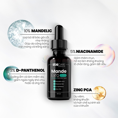 Tẩy tế bào chết MD CARE Mande Exfo là sản phẩm làm sạch sâu và tái tạo da. Với công thức chứa hoạt chất Mandelic Acid, sản phẩm giúp loại bỏ tế bào chết, cải thiện mụn và làm sáng da, mang lại làn da mịn màng, tươi trẻ.