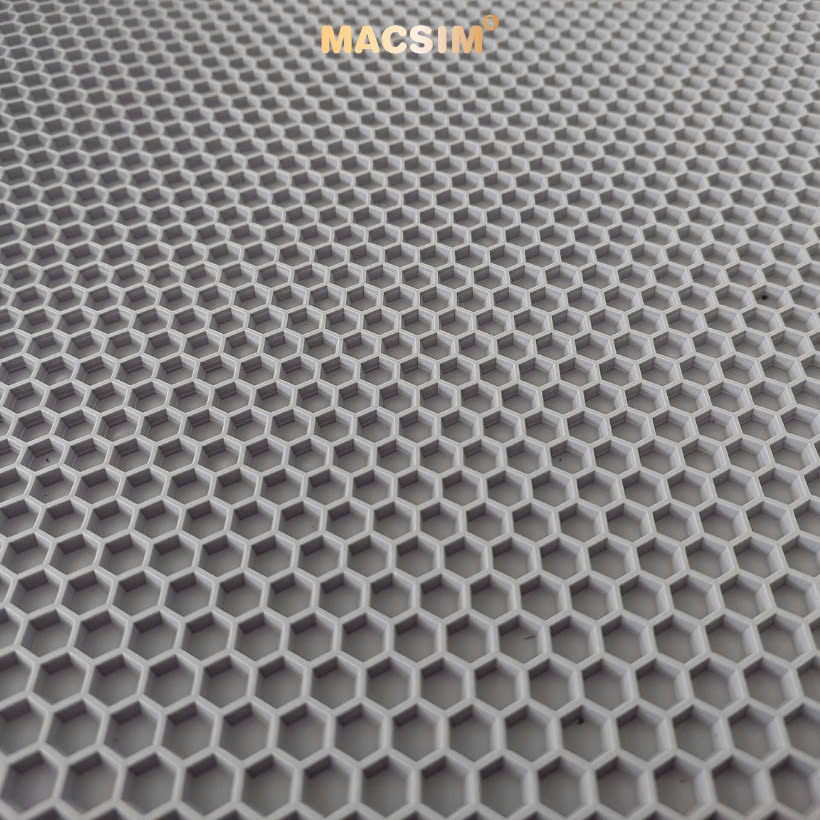 Lớp 2: Thảm dạng lưới lục giác giấu bụi bằng cao su PBR (Polybutadiene Rubber): Chất liệu cao su PBR dẻo dai, độ đàn hồi cao, chống mài mòn cực tốt, không mùi, thân thiện với môi trường và sức khỏe. Thiết kế dạng lưới lục giác 3D thông minh giúp giấu bụi, giữ lại rác và đất cát mà không bị lộ ra ngoài. Khả năng bám sàn tốt, giúp thảm không bị xô lệch khi sử dụng. Có thể tháo rời dễ dàng để vệ sinh riêng, giữ cho lớp dưới luôn sạch sẽ.