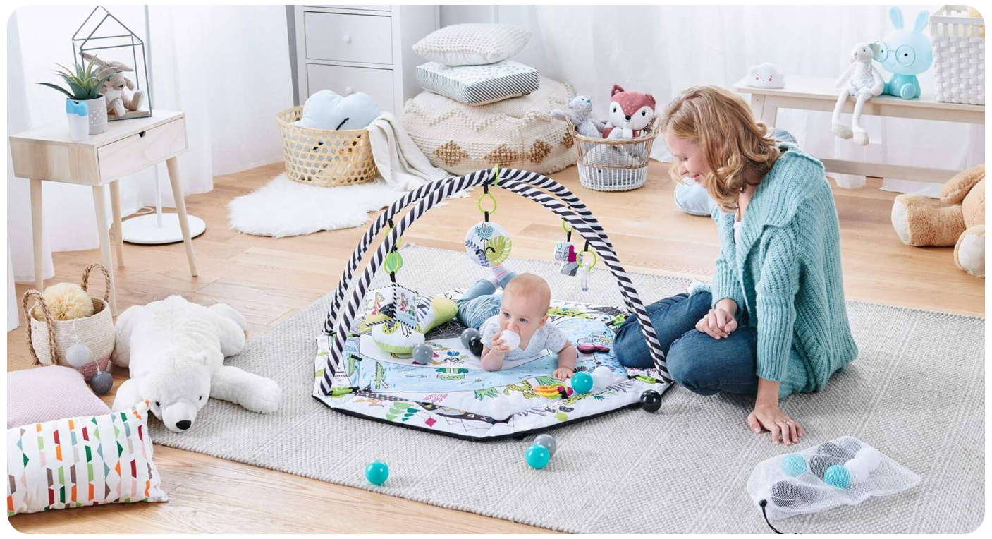 • Đây là một tấm thảm tuyệt vời – kích thích phát triển 4 giác quan: thị giác, thính giác, xúc giác và khả năng tập trung của trẻ ngay từ khi mới sinh •