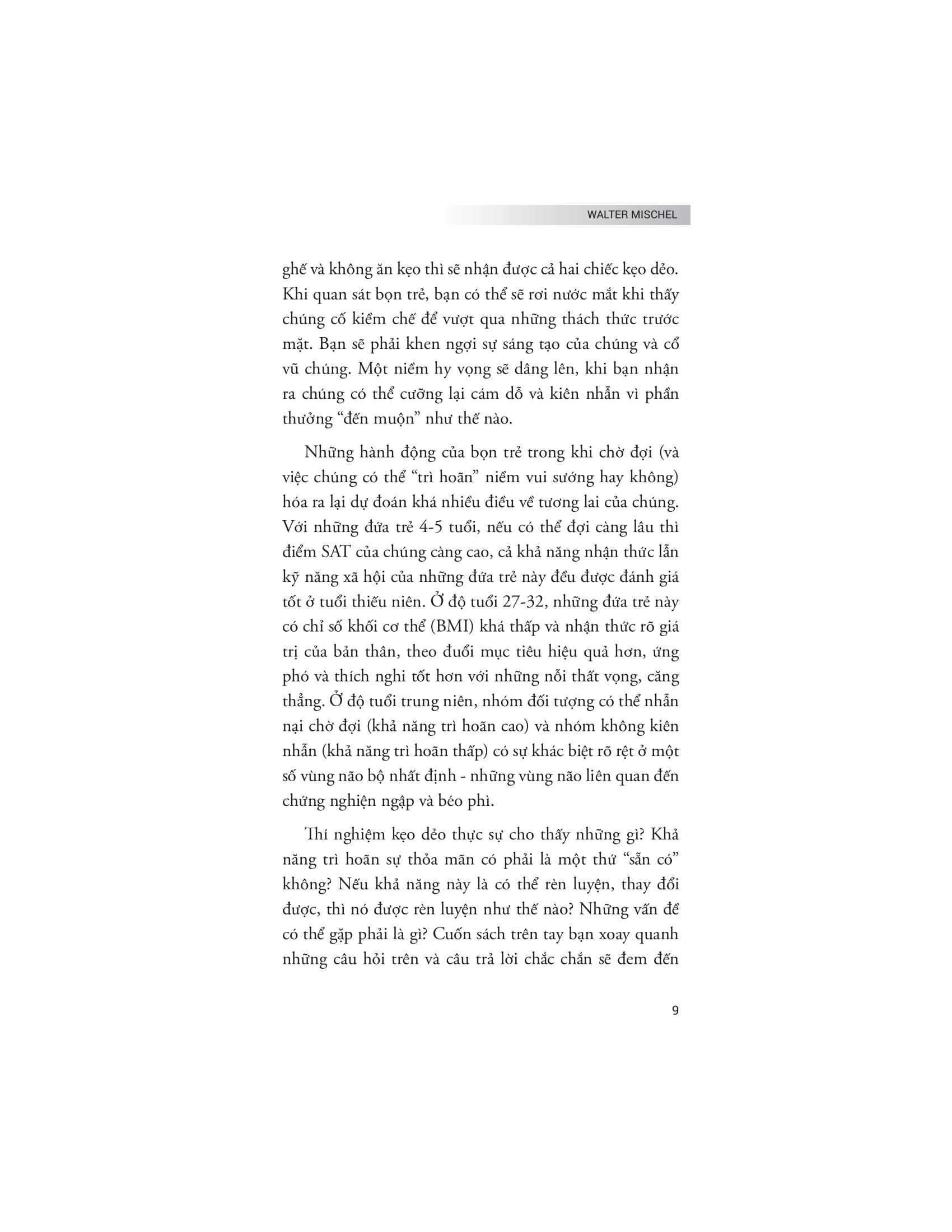 Tác giả Walter Mischel đi sâu vào phân tích các chiến lược và phương pháp giúp cải thiện khả năng tự kiểm soát, từ việc xây dựng ý chí mạnh mẽ đến việc áp dụng các chiến lược tinh thần để đối phó với cám dỗ và duy trì kiên nhẫn. Bên cạnh đó, tác giả cũng chỉ ra những yếu tố ảnh hưởng đến ý chí và sự kiểm soát bản thân, từ môi trường, cách giáo dục đến các yếu tố tâm lý cá nhân.
