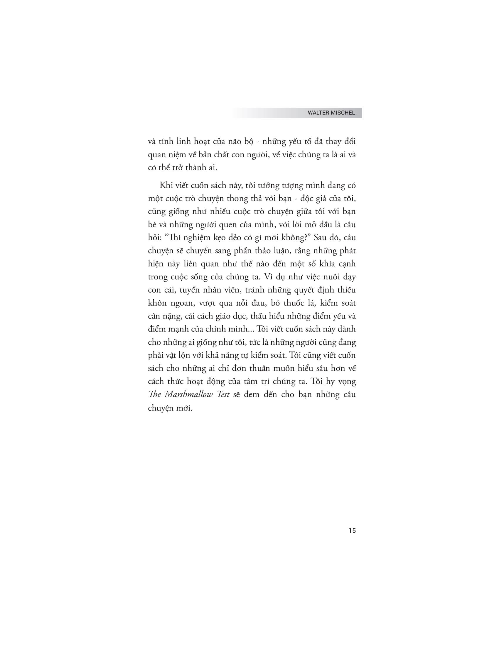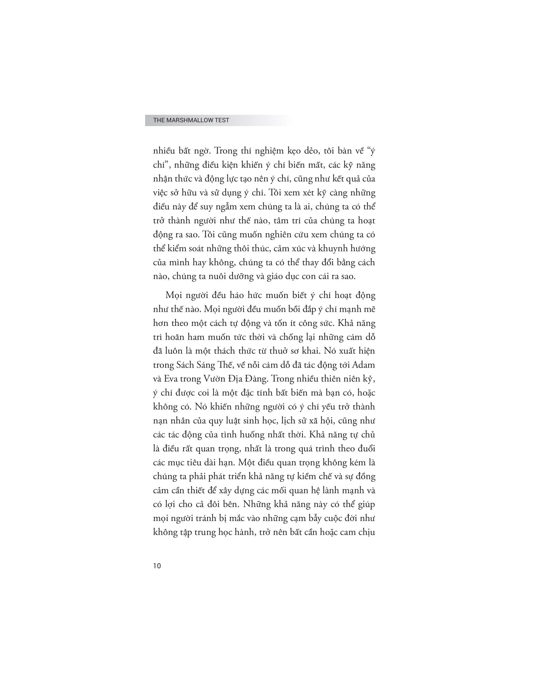 Bằng cách ứng dụng những bài học từ thí nghiệm kẹo dẻo vào cuộc sống thực tế, The Marshmallow Test không chỉ giúp người đọc hiểu rõ hơn về bản chất của tự kiểm soát mà còn cung cấp những cách thức và chiến lược hữu ích để rèn luyện khả năng này. Cuốn sách phân tích cách sự kiểm soát bản thân có thể ảnh hưởng đến nhiều khía cạnh trong cuộc sống, từ việc duy trì sức khỏe tốt, xây dựng sự nghiệp thành công đến phát triển các mối quan hệ cá nhân bền vững. Rất nhiều khía cạnh thú vị và ý nghĩa về năng lực tự chủ đã được các nhà nghiên cứu dày công tìm hiểu. Kết quả rút ra từ công trình này – sẽ giúp các bạn độc giả có một cái nhìn toàn cảnh và chuyên sâu về một trong những kỹ năng thiết yếu nhất của con người.