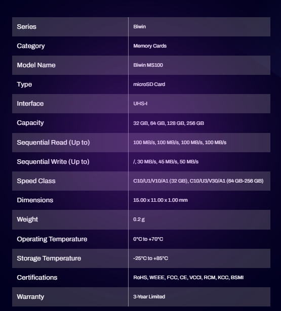 Biwin MS100 là dòng thẻ nhớ microSD 3.0 thế hệ mới, cung cấp khả năng lưu trữ hiệu suất cao với dung lượng lên đến 256GB, mang lại không gian rộng rãi cho hình ảnh, video, ứng dụng khác, v.v.