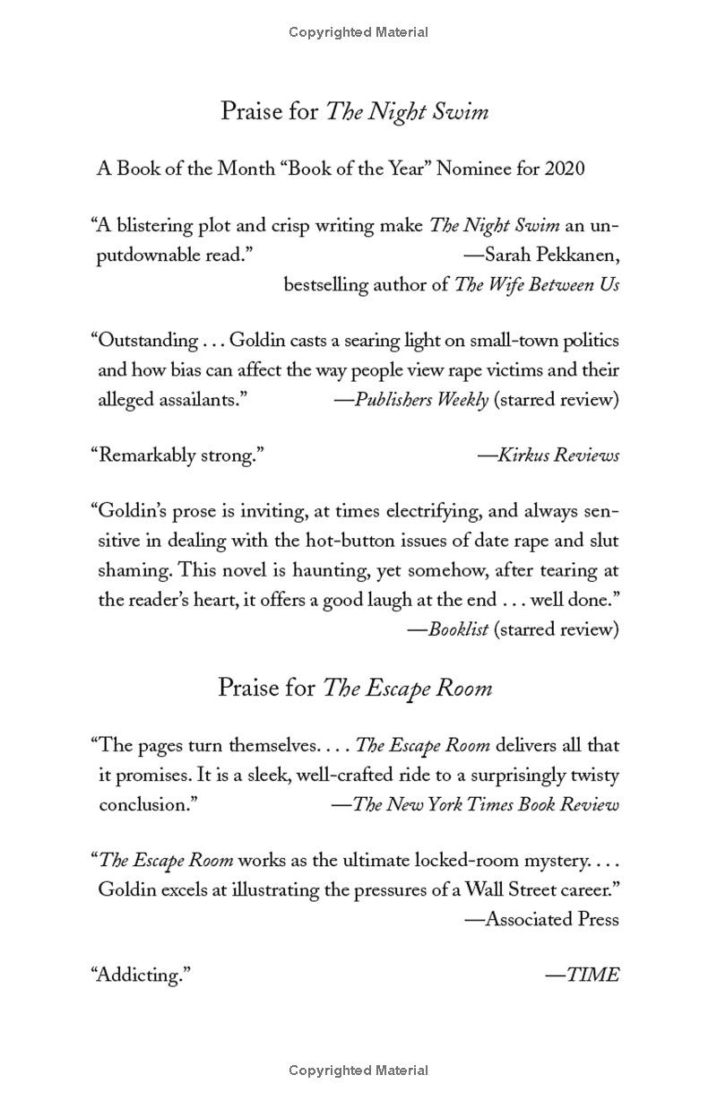 In The Night Swim, a new thriller from Megan Goldin, author of the gripping and unforgettable (Harlen Coben)The Escape Room,a true-crime podcast host covering a controversial trial finds herself drawn deep into a small town's dark past and a brutal crime that took place there years before.