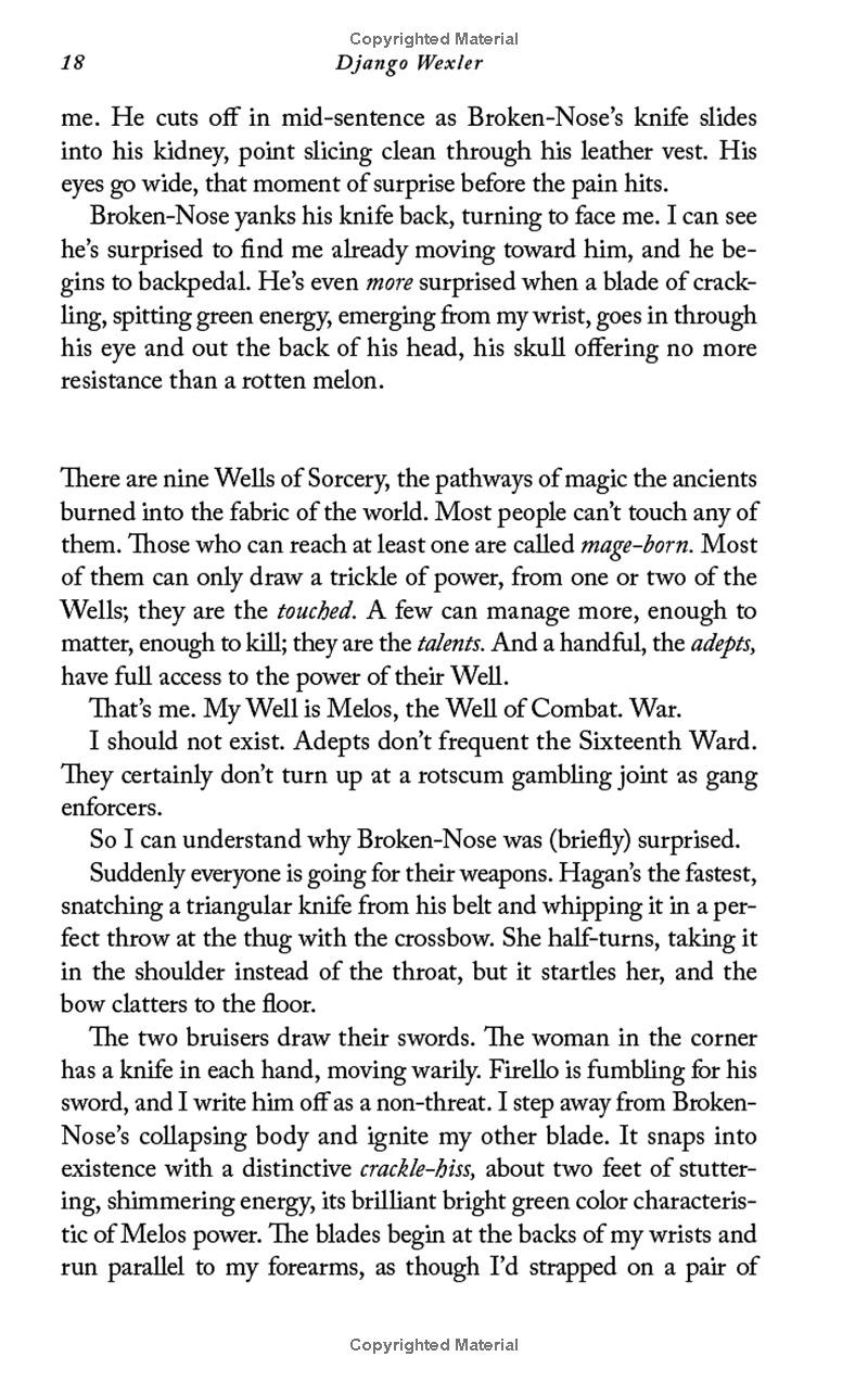 In the lower wards of Kahnzoka, the great port city of the Blessed Empire, eighteen-year-old ward boss Isoka enforces the will of her criminal masters with the power of Melos, the Well of Combat. The money she collects goes to keep her little sister living in comfort, far from the bloody streets they grew up on.