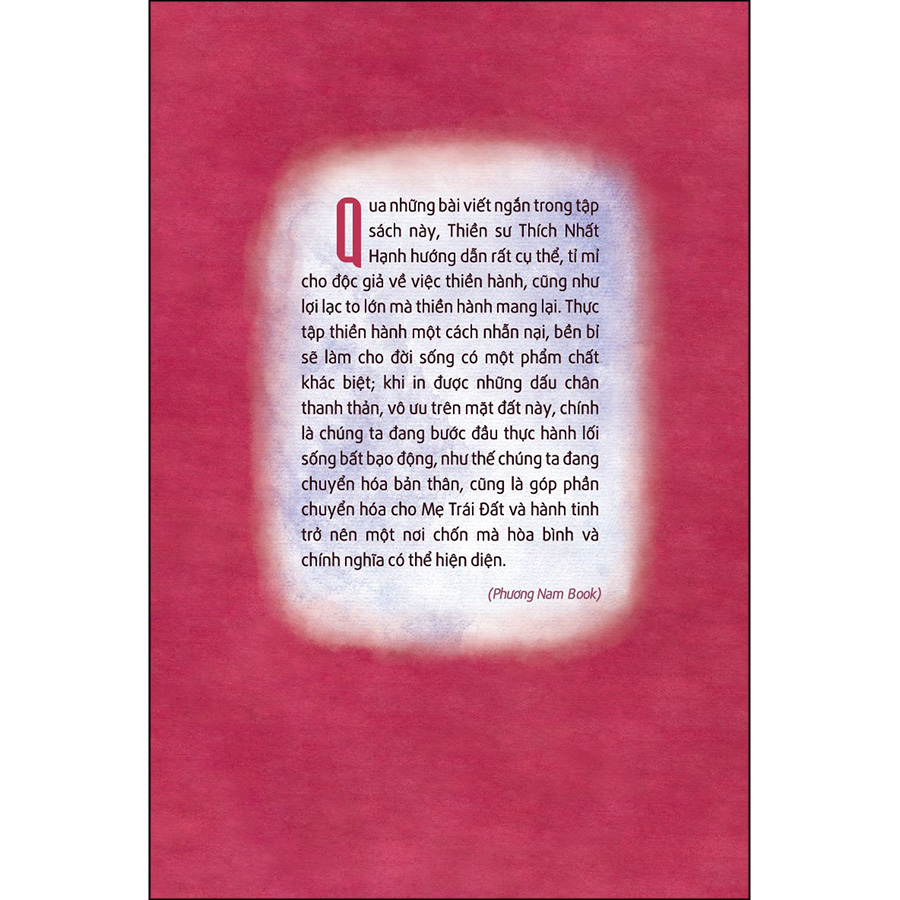 Qua những bài viết ngắn trong tập sách này, Thiền sư Thích Nhất Hạnh hướng dẫn rất cụ thể, tỉ mỉ cho độc giả về việc thiền hành, cũng như lợi lạc to lớn mà thiền hành mang lại. Thực tập thiền hành một cách nhẫn nại, bền bỉ sẽ làm cho đời sống có một phẩm chất khác biệt; khi in được những dấu chân thanh thản, vô ưu trên mặt đất này, chính là chúng ta đang bước đầu thực hành lối sống bất bạo động, như thể chúng ta đang chuyển hóa bản thân, cũng là góp phần chuyển hóa cho mẹ Trái Đất và hành tinh trở nên một nơi chốn mà hòa bình và chính nghĩa có thể hiện diện.